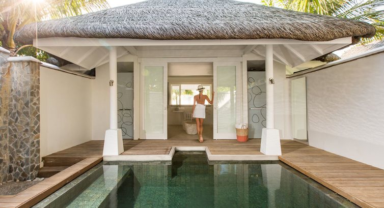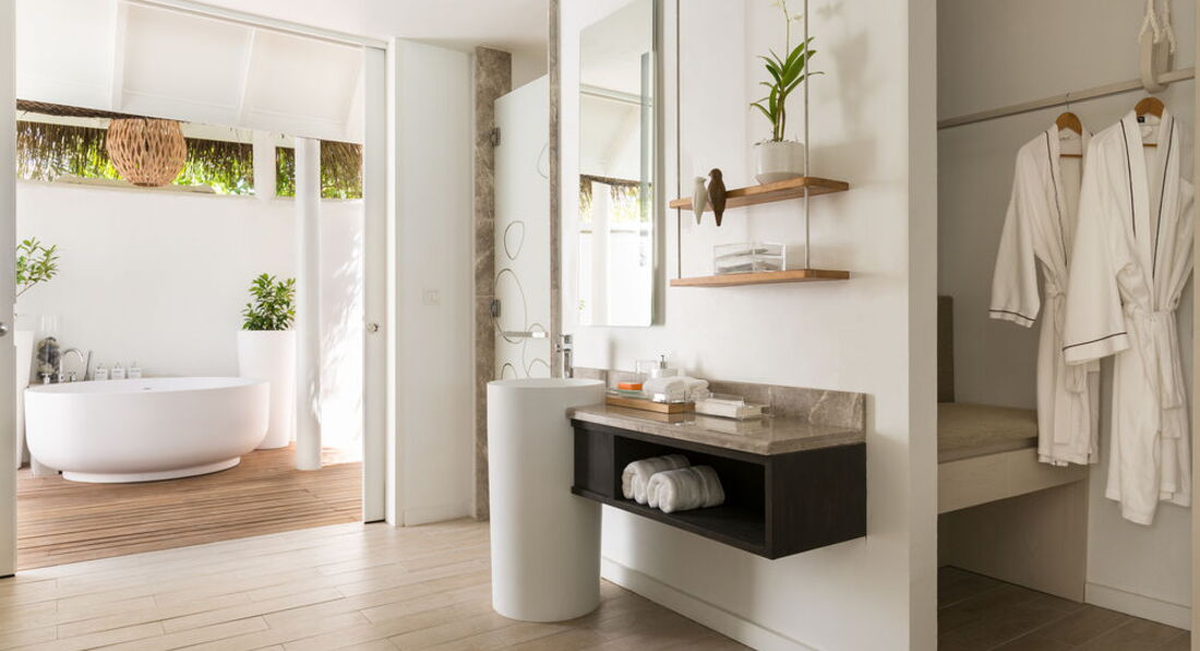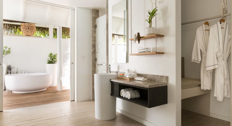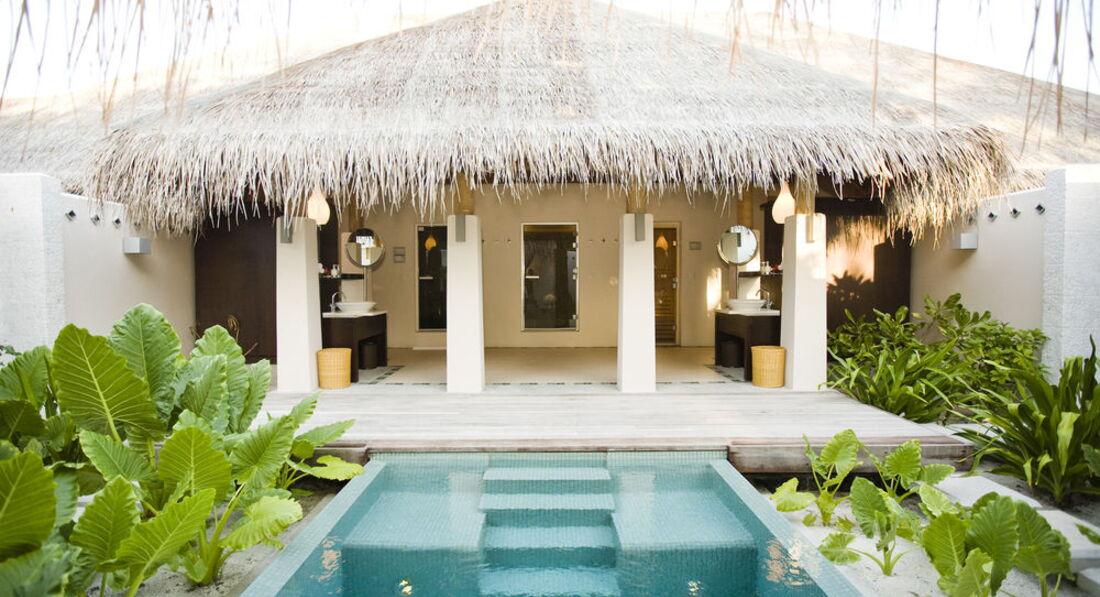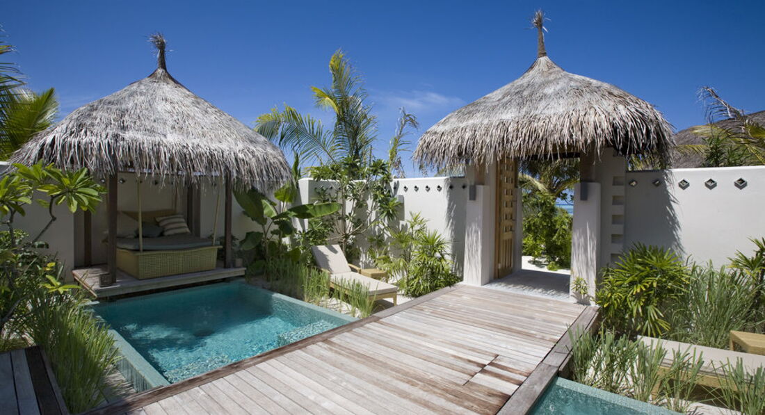 45 Beach Villa (95 м², макс. 3 або 2+2 чол.). Розташовані по обидва боки острова з прямим доступом до пляжу. Спальня з ліжком king-size, ванна кімната на вулиці з ванною і душем, другий душ закритий, тераса.