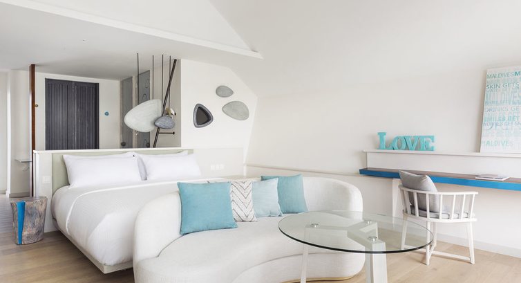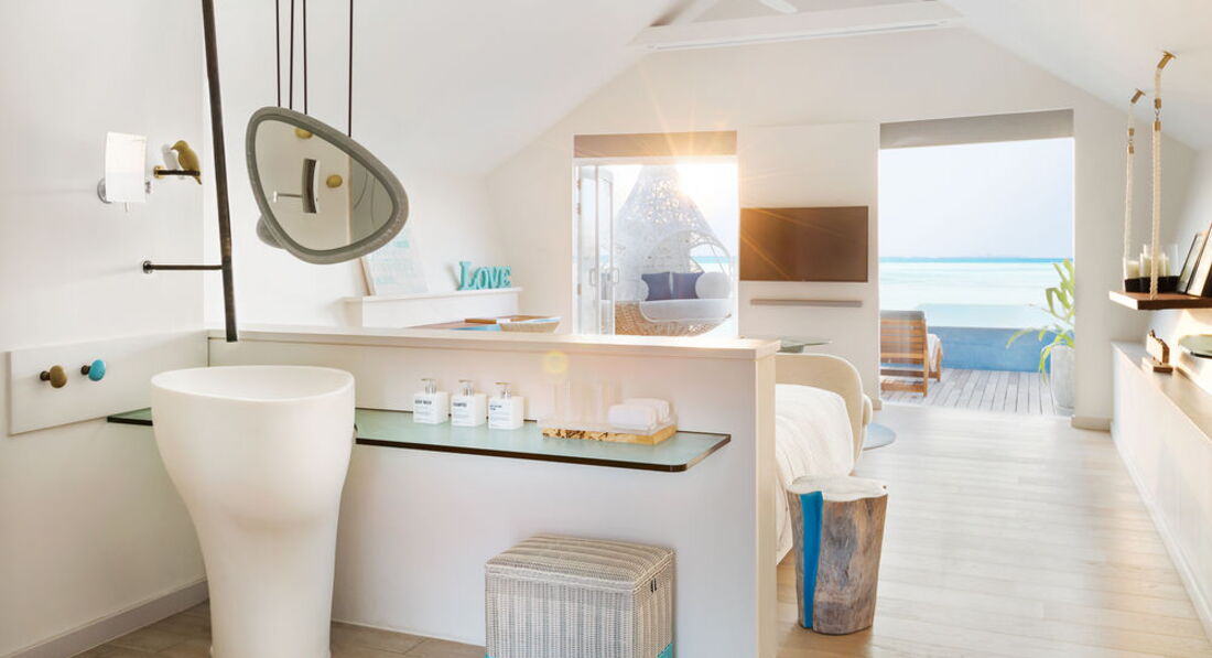 1 LUX* Villa (360 м², макс. 3 або 2+1 чол.). Надводна вілла розташована в самому кінці ряду водних бунгал. Дві спальні з ліжками king-size та ванними кімнатами, вітальня зі скляною панеллю в підлозі та обідньою зоною. Простора тераса з «безкрайнім» басейном, зоною відпочинку та прямим спуском у воду. Вид на захід сонця.