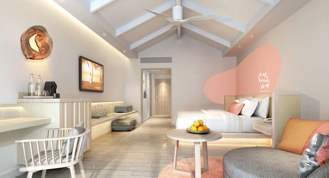 48 Beach Pavilion (60 м², макс. 2 або 2+1 чол.). Розташовані по обидва боки острова. Спальня, тераса із зоною відпочинку. Ванна кімната на вулиці з ванною і душем, другий душ закритий. 18 номерів із ліжком king-size, 18 номерів – ліжка twin. 18 номерів можуть бути суміжними (з дверима).