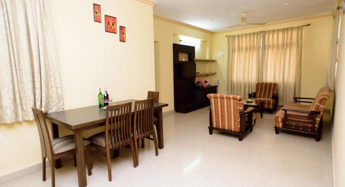 Здравствуйте, отдыхали в этом отеле с 15.02 по 25.02.2017 двумя семьями, у нас 2 детей 3 и 10 лет. Развозили на не больших автобусах по 5 отелям где то, здесь в се зависит от принимающей стороны, наша нам очень понравилась))) Просмотрев 3 предыдущих отеля было огорчились, что отдых в Индии под угрозой, мы много где бывали и конечно не все можно вынести, но подъехав к нашему отелю стало ясно, что он просто лучший, как оазис в пустыни, тишь, зелень, очень приятная атмосфера. Нас привезли в 11.20, а заселение с 12-14, подумала что все устали, детки перенесли перелет, решили взять за плату номер, но на ресепшен девушка сказала, что ничего не нужно, это лишнее, уже в 12 часов мы совершенно без оплаты вас заселим в апартаменты. И ровно в это время мне вручили ключи. Номер просто огромный кухня метров 9, 2 спальни с большими кроватками, гостиная огромная просто, 2 туалета и 3 лоджии, о чем еще мечтать, можно потеряться. Сразу говорю нет плитки и принадлежностей, но это не беда, по вашему запросу приносят все , мы попросили плитку, кастрюлю, сковороду и типа казана посуду и готовили маленькому супчики , а себе креветки, рыбу и все все все.... Завтраки, как и пишут, практически нечего есть. Фрукты, тосты с джемом, блины не вкусные, гренки хорошие, яйца во всех видах(сосиски не ела ни разу, бобы) и пожалуй все!!!Такие завтраки потраченных денег не стоили точно! Море отличное просто, красота, песок как крахмал - скрепит, лежаком много, не было такого что не хватило, в море нет живностей, опасности нет, релакс полный, качайся на волнах, волны правда к вечеру по больше, но прикольно даже. До моря ходит весь день ежечасно трансфер, хотя если что идти минут 10 гуляя по асфальту ровному, не напрягало совсем. На пляже в шейке попробовали 1 раз еду, не мое это, питались либо дома, либо в замечательном кафе hideout еда там отличная , ни разу даже намека на расстройство. У дамы возле минимаркета КАДАР покупали свежие фрукты, не обманывает, цены реальные сверяли с другими рынками, торговля везде есть, но цены хорошо снижают на пляже, ездили по магазинам в Магрен (чай, кожа, сумки, аптека) накупили все. Водители в отеле возят куда угодно, цены реальные у них, совет дадут и по русски нормально общаются. В отеле бассейн нормальный, нет массового народу нигде, как то все спокойно и размеренно. Отдых понравился очень, отель хоть 3 звезды, но почему не больше не знаю, качество хорошее обслуживания, угодить во всем мечтают просто, наверное из за еды. Ку шали первый день в кафе отеля, кушать можно, но отведав в других местах, больше сюда не вернулись. Пробуйте огромные креветки, лобстеров, крабов и т.д. Цены вас приятно удивят, все наши товары в 50% дешевле, даже самые фирменные. Соки даже в пачках очень вкусные. Отдыхайте с удовольствием, приезжайте сюда, здесь действительно вам понравиться)))