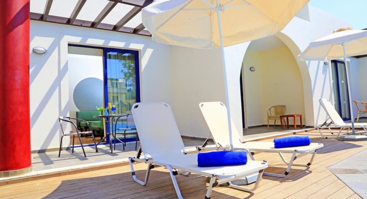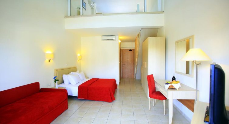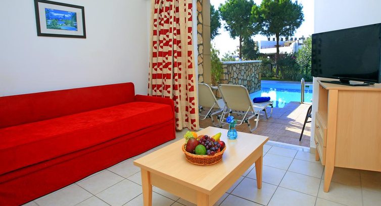 Типи номерів: superior room (основне ліжко – 2 односпальні, дод. – софа, макс. 2+1 чол., 32 м2); superior room pool side (основне ліжко - 2 односпальні, дод. - Софа, розташовані біля басейну, макс. 2 + 1 чол., 32 м2); family room (спальня та вітальня з дверима, основне ліжко – 2 односпальні, дод. – софа та розкладне ліжко, макс. 3 + 1 чол., 30 м2); family room pool side (спальня та вітальня з дверима, основне ліжко – 2 односпальні, дод. – софа та розкладне ліжко, розташовані біля басейну, макс. 3 + 1 чол., 30 м2); family maisonette sharing pool (дворівневий номер, нижній рівень: спальня та вітальня з дверима, ванна кімната, верхній рівень: спальня; основне ліжко – 2 односпальні, дод. – двоспальне та софа, доступ до загального басейну на 2 номери, макс. 4 + 1 чол., 555 м2).У номері: сейф: у номері, безкоштовно зміна білизни: 3 рази на тиждень кондиціонер: індивідуальний безкоштовно банні приналежності ванна зміна рушників: 3 рази на тиждень підлога: керамічна плитка прибирання номера: 3 рази на тиждень фен: є балкон або тераса ТБ: супутникове Інтернет: Wi-Fi, безкоштовно міні холодильник
