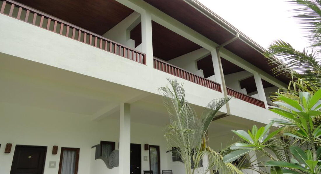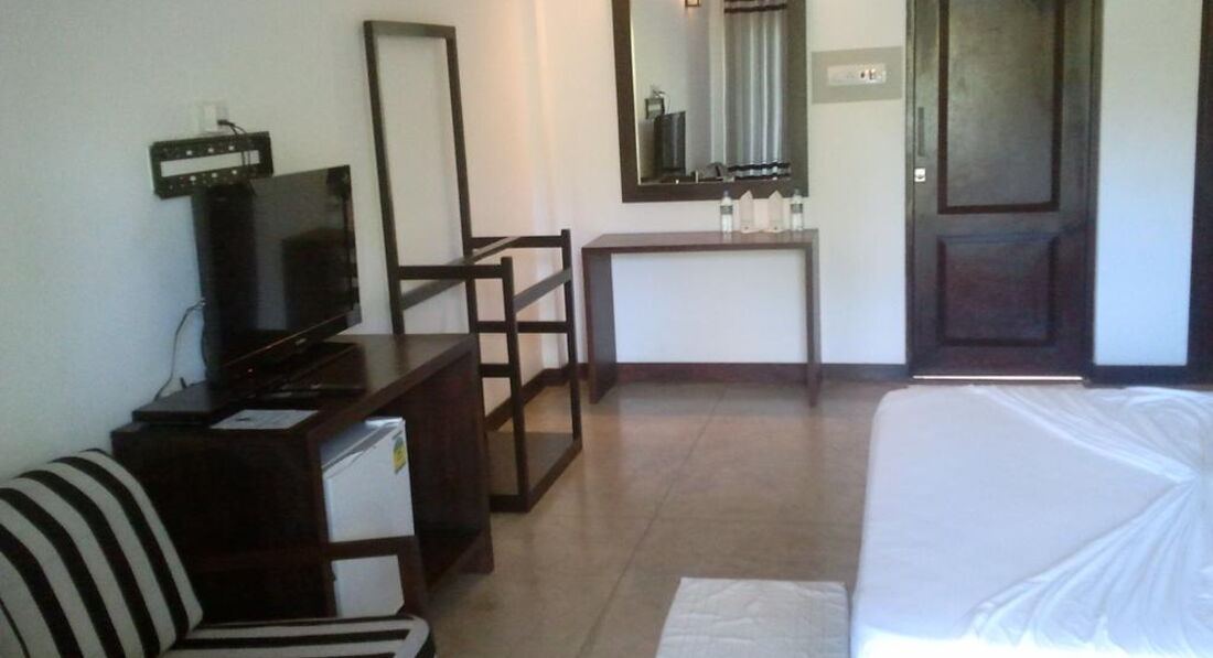 Преодолев строящуюся арку из бетона, где стоит бетономешалка, от которой исходит типичный запах стройки, вы оказываетесь на территории. Сразу справа, примыкая к стройке (или наоборот стройка примыкает, как больше нравится), находится "Old" корпус, то есть "старые" корпуса. Слева - возле бассейна, будут находится "New" корпуса, то есть "новые" корпуса. Старый корпус - это вытянутый двухэтажный домик, кажется на 8 номеров (по 4 номера на этаже). Номера сырые, темные, имеют запах сырости, смешанный с антимоскитными средствами. Пол - кажется деревянный, густо крашеный бурой краской (так красили полы в советских пионерлагерях). В номере есть кровать, старая до невозможности - такие мы свозим обычно на дачи - тумбочка с зеркалом, которое от влаги по краям имеет темную резную каемочку, и какой-то настил из дерева - деревянная подставка, куда положено класть чемодан с вещами, ибо шкафа для хранения вещей вещей тут не предусмотрено. Есть сушилка для белья - такие деревянные рамы, на которые натянуты веревочки. Эта конструкция стоит напротив кровати в номере, за неимением шкафов и др. предметов мебели используется на "ура". Есть "ванная комната", где есть толчок, рукомойник, пластмассовое зеркало, душ с холодной водой и сливом прямо в полу. Номера типа "Old" стоят на 10 долларов с сутки дешевле номеров "New" и в номерах "Old" живут большей частью индусы или местное население. Возможно, в обычные, не пиковые даты (а мы были тут с 26 по 29 декабря), в этом корпусе никого не окажется, кроме вас...