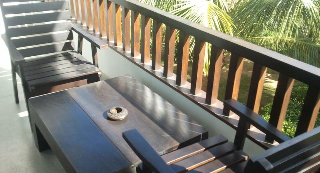 Территорию отеля вполне можно назвать зеленой, но заброшенной и мало ухоженной при этом. Травка - сама себе растет, деревьица - да тоже вроде растут благополучно.. Где тень, там травка не растет, - обнажается земля и это вызывает какое-то унылое настроение. В отеле есть бассейн - О ДА! - это конек этого отеля! Именно поэтому этот отель стоит аж 80 долларов в сутки (не на НГ будет дешевле, разумеется). Об этом отель в переписке сообщает с гордостью, ибо в других отельчиках никакого бассейна нет. Нормальный бассейн, но из корпуса "Old" или из навеса для завтраков (он как раз возле бассейна находится) вызывает тоже унылое настроение: снаружи бетон, какие-то отвалившиеся крышки и детали, бетонная дорожка, рядом растут огромные деревья, под которыми голая земля, потому что не растет трава из-за густых крон... в все это возле этого бассейна... Ну ничего, вечером поплавать иногда приятно будет.. В бассейне поджигаются лампочки, что, в общем, тоже приятно. Что еще есть на территории отеля.... Навес под тростниковой крышей для еды. Там можно поужинать и позавтракать. И вообще поесть. Не буду повторять, что подают, думаю, отправляясь на ШЛ, вы примерно представляете, что там едят. Так вот здесь, ничего особенного, все так же, как и везде. Если будете с детьми, то имейте в виду, что завтраками их кормить нельзя (если только вы сами не индусы), так как все отвратительно острое и с характерными приправами. Заказывать детям нужно будет по меню и из числа тех блюд, куда вряд ли будут класть приправы.