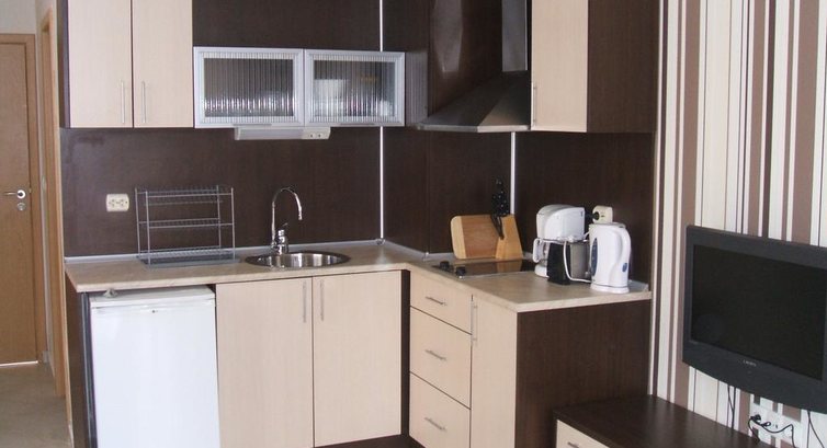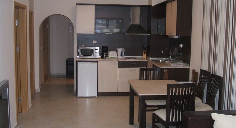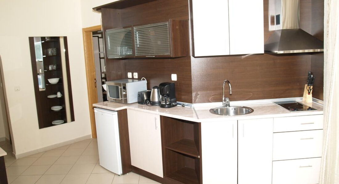 Вернулись на ресепшен и доплатили 50 евро за апартаменты. Апартаменты там милые, с икеевской мебелью, кухонькой, душевой кабиной, балконом. Если бы мне пришлось ехать в этот отель еще раз, то я бы брала только апартаменты (если без детей, то на втором или третьем этаже) и только с видом на бассейн. Остальные жилища выходят окнами либо на паркинг, либо на стройку.Моря не видно ни из одного номера.