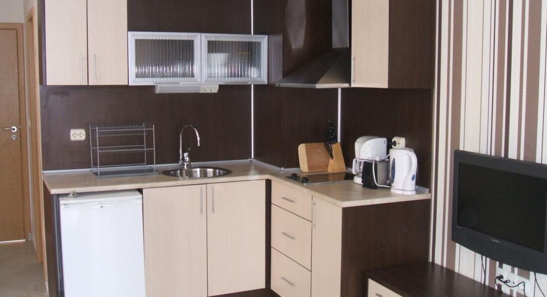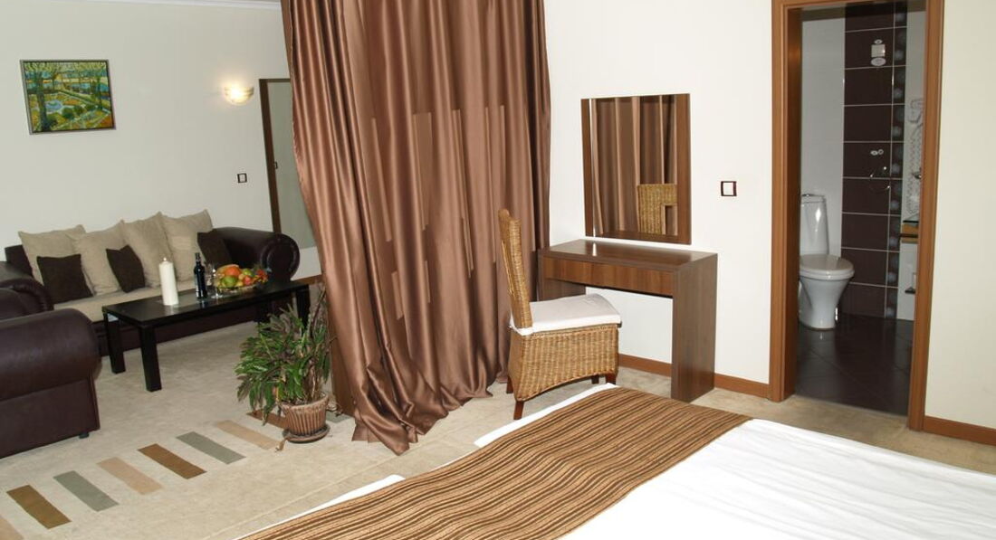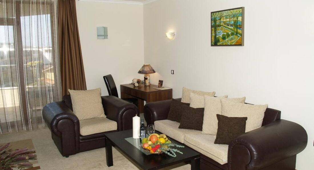 Отдыхали семьёй с 26,08,2010 по 05,09,2010 апартаменты 2403. Номер супер, есть всё - холодильник, телевизор, телефон, эл. плита, свч, тостер, чайник, стиральная машина, утюг, гладильная доска, набор посуды (тарелки для первого, второго и третьего, чашки, бокалы, стаканы, ножи, вилки, кастрюли, сковородки), короче всё что на любой кухне. Номер состоит из 2-ух спален, 2-ух сан узлов, в одном ванна, в другом душевая кабина и огромной гостиной, из всех комнат есть выход на балкон длиною более 10 метров. В номере стоят кондиционеры. Убирали и меняли полотенца в номере каждый день. За всё время пребывания ни разу ни кому не давали чаевых и ни кто ни делал ни каких намёков. Периодически на кроватях делали всякие ракушки и прочие морские прелести из полотенец и одеял. Болгарский язык мы не знали, то есть прочитать и понять смысл очень легко, но когда слышишь речь, то ни понимаешь вообще ни чего и ни каких проблем с общением у нас не возникало ни разу. На ресепшене все всё понимают, гувернантки тоже, хотя по русски они не говорят, но проблем с общением ни разу не возникало. Номера, прилегающая территория и все что находиться на вокруг вычищена до блеска, ни где не увидишь грязь или не убранный мусор. Зонтики и шезлонги на пляже бесплатные. Относительно питания всё продуманно, с 8-00 открывается ресторан, после завтрака он не закрывается, там всегда можно налить кофе, чай, пиво, сок, вино и местные крепкие алкогольные напитки в плоть до закрытия, а это 23-00, так же всегда можно взять выпечку или бутерброды, мороженое, фрукты. С 11-00 открывается пляжный бар, там можно и поесть - пицца, сосиски, жареная рыбёшка + вода, соки, пиво. После обеда там за место сосисок и прочего жарят блины, вот на них мы ни разу попасть не смогли, так как процесс долгий и каждый берёт по 4 штуки в среднем, а если перед вами ещё 3-4 человека, то можно встать на пол часа в очереди. В обще кухня однообразная, мы поначалу ели всё, но с каждым днём всё меньше и меньше, через 5-6 дней завтракать просто уже не могли, но надо было кормить ребёнка и мы всё же ходили в ресторан, пока дочь ела хлопья с молоком мы просто пили кофе с булочками, на колбасу, сосиски, омлет и яичницу смотреть уже больше не могли. Обед шел как то более радостно, ужин ещё радостней. По субботам в ресторане полностью национальная кухня, так же с 19-00 возле бассейна устраивают показ народных танцев, с музыкой и пением, попали мы на это 2 раза - очень понравилось. Ездили в Созополь несколько раз. Гид сказал что ходит некий "мифический" шатл, проезд в котором стоит 2 лева с человека, за всё время ни разу его не видел, зато можете заказать такси на ресепшене, ждать 3-5 минут, стоимость проезда зависит от - выходной ли день, или будни, дадут ли вам чек, или нет, так что мы платили от 6 до 9 лев и каждый раз по разному. Так же в самой гостинице есть персональное такси - оно самое дешевое, толе 5, толе 6 лев, но оно не всегда на месте. Ходить пешком до города не советую - дорога очень извилистая, правила (скоростной режим и запрет на обгон) ни кто особо не соблюдает, тротуара нет, так что риск для жизни.