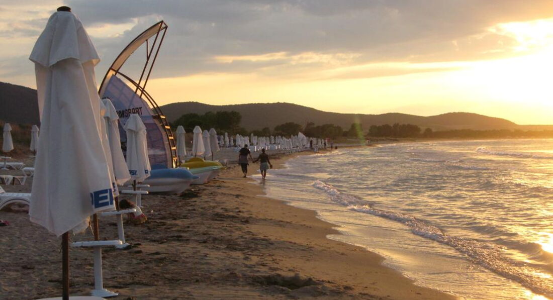 Пляж рядом, песок грязный, море мелкое, у берега плавают морские клопы, которые жалятся. Медуз не много.