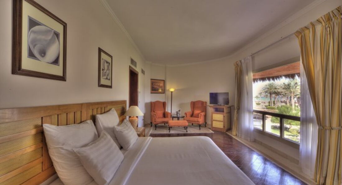Отдыхали в этом отеле в июле 2015 года,тур-оператор_ Библиоглобус, В Египте не в первый раз, Сам отель на 5* не тянет,по сравнению с другими отелями 5 Египта.По приезду сразу зарегистрировали,но заселили,только после обеда,т.к номер не готов был якобы............Кормили вкусно,много,и разнообразно,только вот в ресторане где ужин проходил,бара не было и чтобы заказать какой либо напиток,нужно было вылавлить официантов 3-4 на весь ресторан,ну а если и поймали официанта то приносили напитки к концу ужина((((..... а вот бар на пляже другое дело,очень приветливый бармен Адель,в такую жару всегда выручал напитками...в начале отдыха оставили ему 2$чаевых,с того момента,ни в чем нам не отказывал,а если у бара очередь,то нас он не заставлял ждать) Номер у нас был не в бунгало,обычный стандарт в корпусе,ванная конечно пошарпанная....убирали не очень,полотенца меняли ежедневно,постельное белье не знаю меняли ли?! Что касается моря,то тут большой минус..........что бы дойти до глубины,потребуется много терпения,и лучше если собрались все таки,то намазаться солнцезащитным кремом,т.к идти по воде придется минут 30 в одну сторону,и столько же в обратную. Подводный мир не очень богат.