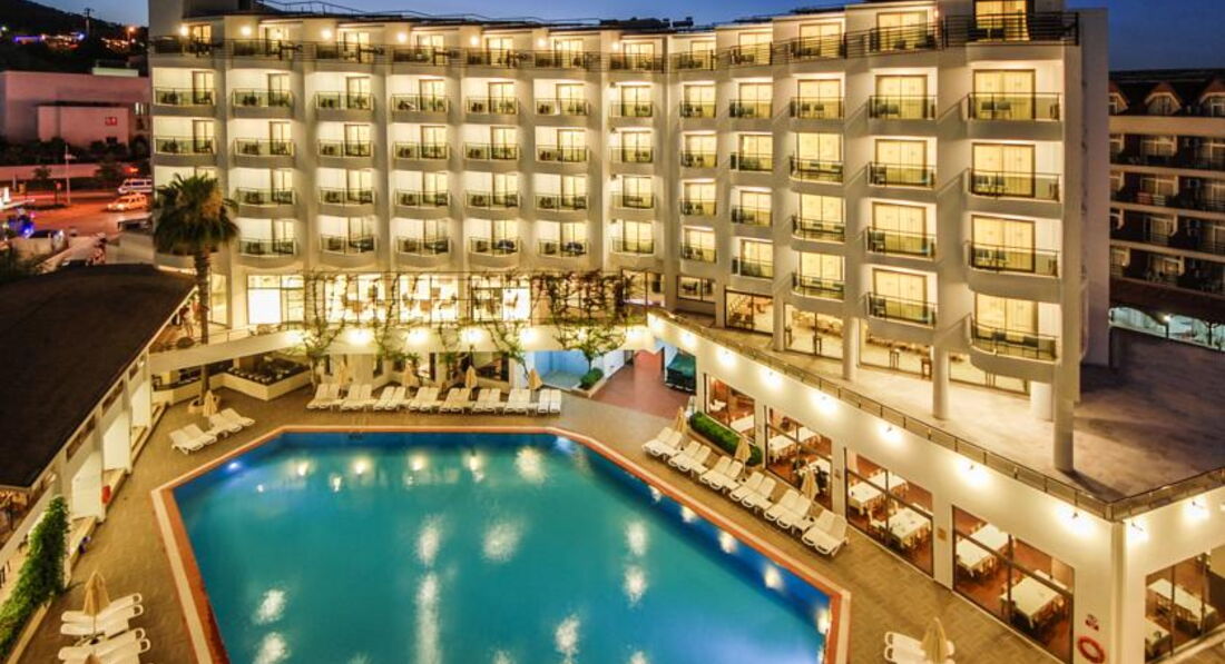 Небольшой отель на второй линии, своего пляжа нет (лежаки и зонтики платно).Пляж классный, песчаная галька. Спокойный, тихий отель. Днем хорошая анимация, аниматор девушка, говорит на всех языках очень хорошо. По вечерам ни дискотек, ни музыки нет, но это покрывает всё, что он стоит в центре, вокруг куча разных дискотек и развлекалово вдоль побережья моря. Классный ресторанчик напротив отеля Паша Бич. По вечерам в центре Мармариса - поющие фонтаны на центральной набережной (завораживающее зрелище). Еда - разнообразием в отеле особо не блещет, в основном одна курица (жареная, вареная, желудки, сердечки, печень). Напитки: пиво, вино трех видов, джин тоник, мартини, из крепких - только их водка. Нам всё понравилось. Отель твердая тройка.