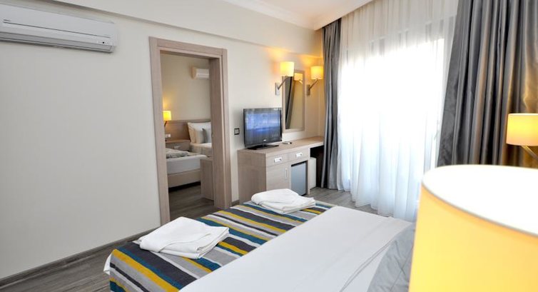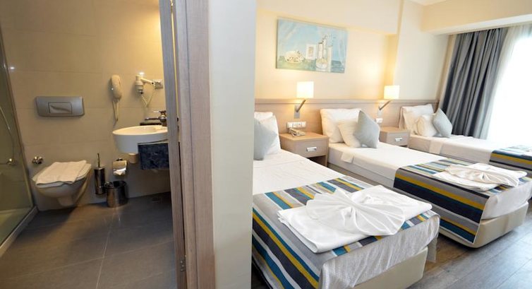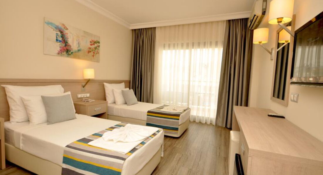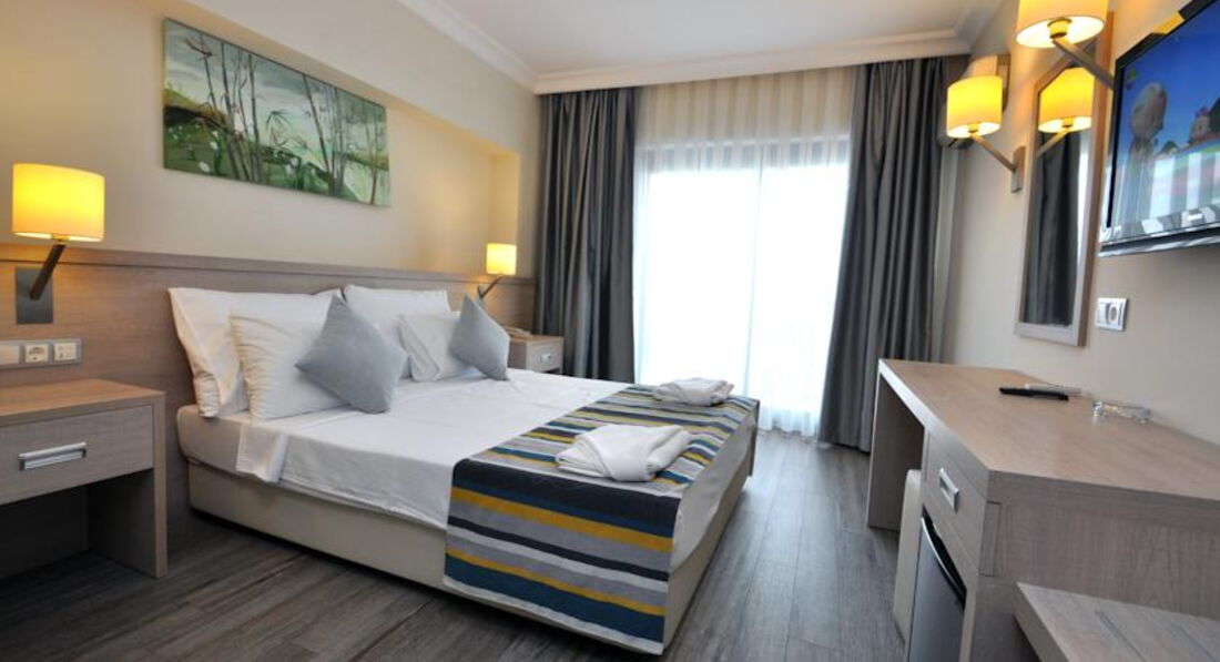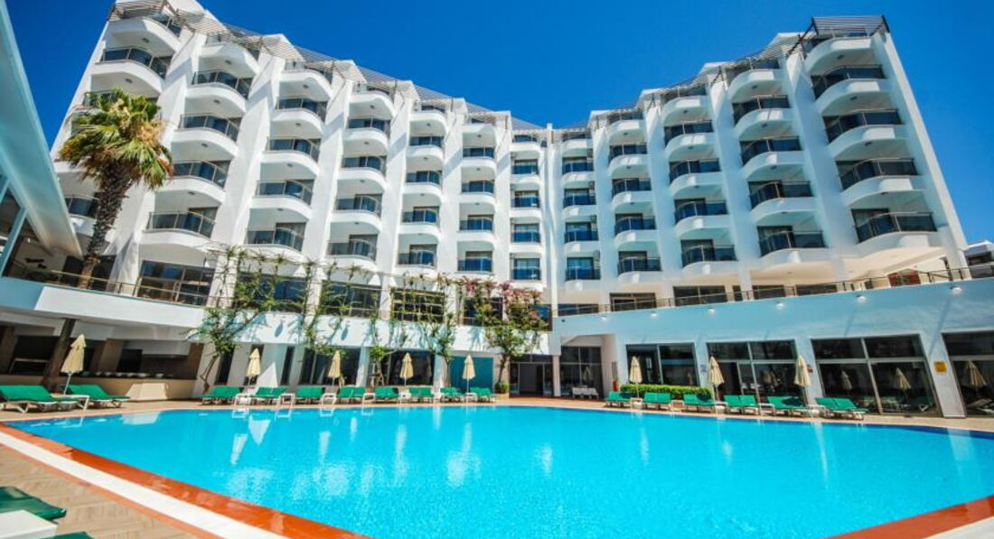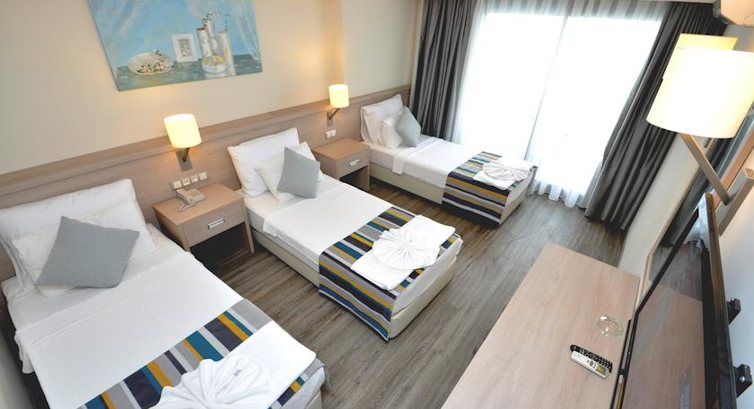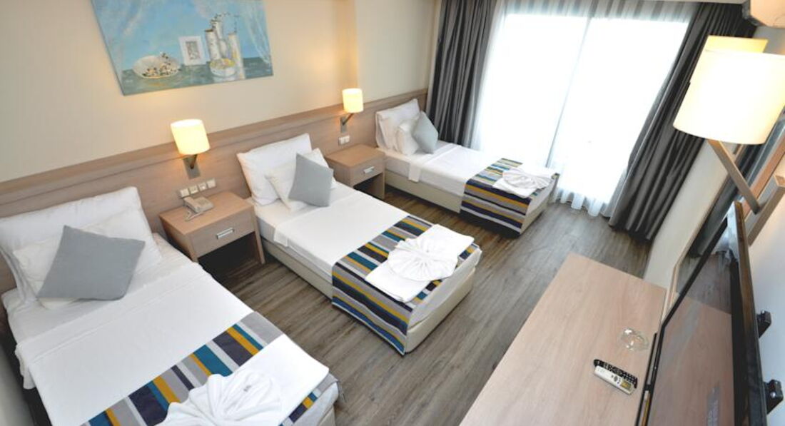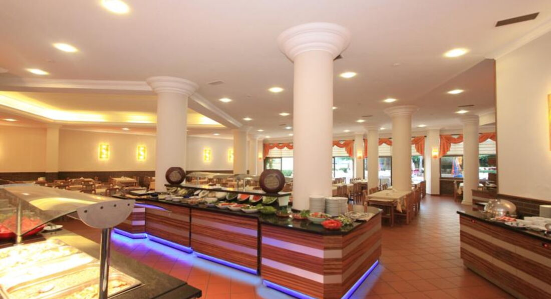 Отель расположен в 5 минутах на автобусе и 30 минут пешком от центра, рядом Мигрос, напротив отеля турагенство (лучше покупать экскурсии там, дешевле в 1.5 - 2 раза, чем у туроператоров). По приезду нас заселили сразу, а не так как сказал гид - не раньше 14 часов. Территория отеля небольшая, русских и молодежи мало, персонал очень дружелюбный. Еда была вкусной и разнообразной. На ужине напитки платные, но недорогие. Номера большие и чистые. Убирались один раз в день утром, но если на ручку двери не повесишь табличку, что надо убраться, горничная не будет убираться. Море рядом, 5 минут ходьбы. При отеле собственного пляжа нет. Пляжи все платные (от 5 лир за человека), но можно и поторговаться с бич-боем.