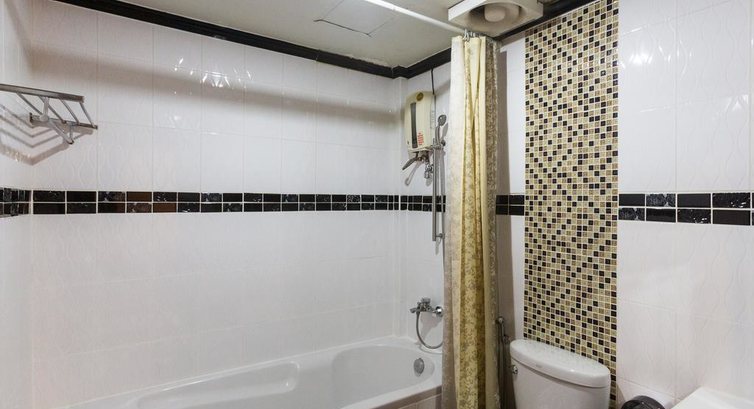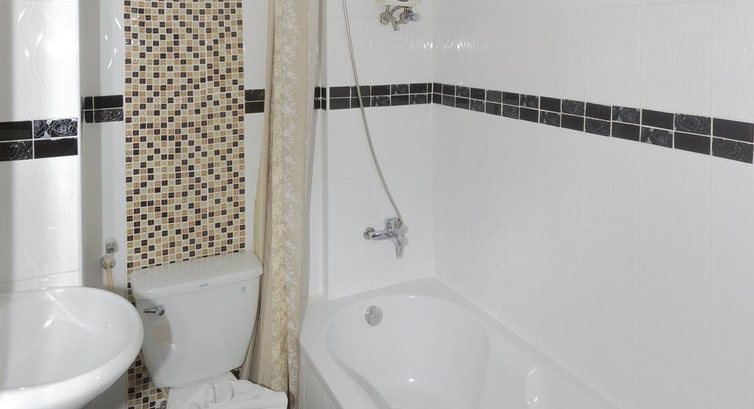 •ванна кімната з ванною або душовою кабіною, феном і туалетним приладдям.