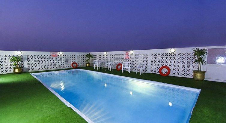 Бассейн на крыше - 20м2 площадью, лежаков действительно 3 или 4, но и народу около него собирается 5-6 человек.