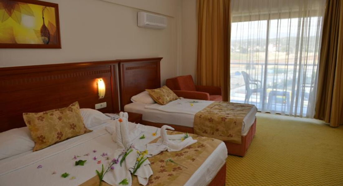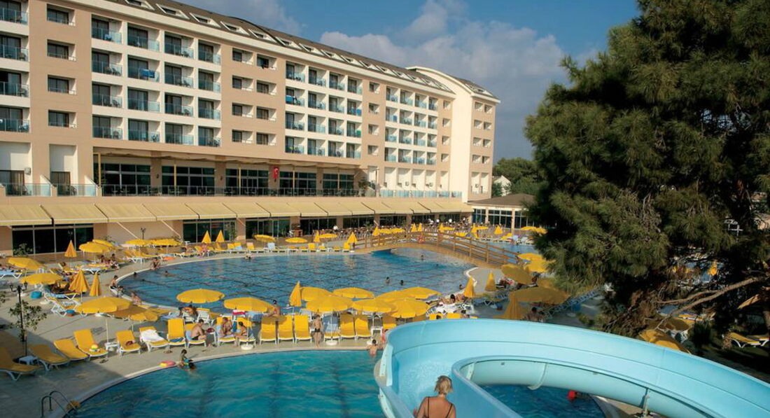 Заехали 13 мая в 12:00,заселили в 13:30,хотя должны были в 14:00.В принципе отель нормальный,территория большая,бассейн огромный,лежаков всегда хватало.Половина постояльцев в основном турки.Из минусов:скудный ассортимент алкоголя(водка,раки,джин,пиво и 2 вида вина),фруктов(яблоки 2 вида,грейпфруты и апельсины).Причем апельсины и грейпфруты порезаны на дольки-это вообще что-то с чем-то(первый раз такое видел ,причем в сезон сбора урожая).Автоматы с соком постоянно ломались,ассортимент горячих блюд мал-3 вида гарнира,2 вида мяса.Да и стаканы были ОДНОРАЗОВЫЕ!!!!!!Пляж убогий и не ухоженный,запущен так что просто труба,вход мелкая галька.Так что отдыхать в принципе можно,но я лично не советую.....