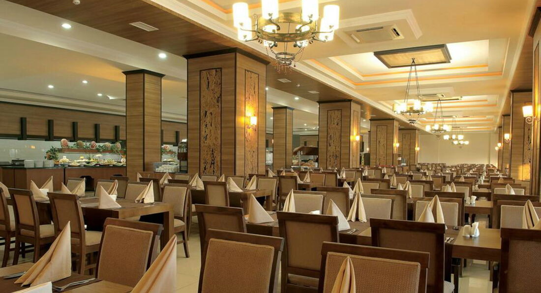 Бари та ресторани: головний ресторан – міжнародна кухня, 800 чол., критий, з терасою, є дитяче, вегетаріанське та дієтичне меню; бар на пляжі (10:00-18:00), бар біля басейну (10:00-24:00), лобі-бар (цілодобово), вітамін-бар (10:00-18:00), Irish Pub (16 :00-22:00), Cafe Turk (18:00-24:00), Wine & Beer House (18:30-23:00) - безкоштовно, диско-бар (23:00-03:00) - платно . 3 ресторани А"la carte: італійської кухні, рибної кухні, турецької кухні - безкоштовно.