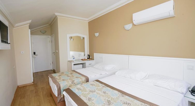 Заселили в номер через пару часов, стоял сильный запах курева - турки в номерах частенько курят для них норма, даже пепельница стояла в номере. А дальше не нужно быть Леной Летучей, чтобы заявить, что в номере сплошная грязь. Про раковину многие писали - да, она маленькая, граничит с душевой и к ней пройти только боком, вся вода на полу, полки стоят криво - все скатывается, душевая кабинка дырявая - вода сочится, лейка в душе вся ржавая и раздолбанная, плитка вроде лежит, но не аккуратно промазаны швы, в душе грибок. Положили маленький гель для душа, шампунь, кондиционер, не смотря, что 2 человека на 12 дней и закончились - обновлять никто не собирается. Туалетной бумаги с самого начала было 2 рулона, после первой уборки забрали второй, оставили только один, пришлось ходить в туалет в лобби, чтобы взять туалетной бумаги, когда закончилась. Полотенце такие серые и растрепанные, ржавые пятна, что ты сперва даже не понимаешь, это куда на пол или вытираться. На пляж дают лучше полотенце, но из 12 дней только 3 дня они лежали доступны, каждый раз приходилось подходить на ресепшен и напоминать. Полы грязные, нижняя часть кроватей вроде когда-то была белой, теперь же серая и страшная. Белье за 2 недели меняли только 1 раз, вместо одеял белые разодранные покрывала, махровое одеяло прожжённое утюгом что ли и какое-то засохшее варенье, подушки разные: синтетическая очень неудобная, т.к. не принимает форму головы и подушка я медуза - я медуза. Разбитая лампа, разодранный выключатель, отодранный держатель для штор, дырявые шторы, кондиционер, на котором лежит толстый слой пыли спереди, он может работать и вдруг выключиться или начать пищать пока не обесточишь. Грязные стены, кто-то сверху на шкаф 2-х метровый положил денежку, видно в надежде, что там кто-то уберется все-таки. В номере был маленький холодильник, правда кривая дверца и нужно было уметь его закрывать. WI-FI в номере не очень, пока один сидишь - хорошо, кто-то еще параллельно вошел в сеть, то совсем плохо работает. Дверь в номер открывалась электронным ключом, с самого начала он дурил, а в последние дни минут 5 приходилось стоять, чтобы его открыть - он просто пищал, но открывать не собирался, только после многократных жалоб в последний день пребывания поменяли батарейки в замке. На кухню меньше всего нареканий, но на 3-й день начались проблемы с желудками, есть предположение, что это вода в чае вечером, т.к. она была платная и никто кроме нас ее не пил, только после перехода на воду из кулера все нормализовалось, но не могу на 100% утверждать в чем проблема была. Как-то на завтрак попалось тухлое яйцо сваренное вкрутую, на ужин была паста, с кислой уже явно бродившей подливкой, зеленые мандарины, безвкусные дыни. Но все-таки можно найти съедобное, поэтому мой завтрак состоял из яиц, выпечки, оливок и кофе, ужин - рис, мясо, свежие овощи, арбуз иногда давали пахлаву. Также попадались тарелки с сколами и грязные снизу - что-нибудь засохшее с предыдущего приема пищи. Пляж частный, поэтому ходят туда все подряд, немного грязноватый, но есть лежаки и зонтики. От отеля дают билетики на пляж, у нас неделю их не спрашивали, а когда я его забыл, у меня спросили и потом опять не спрашивали, мелкая галька, хороший вход в море, но в воде стоять нельзя, т.к. мелкая рыба неприятно кусает за ноги. Самолеты над тобой летают регулярно, но не напр
