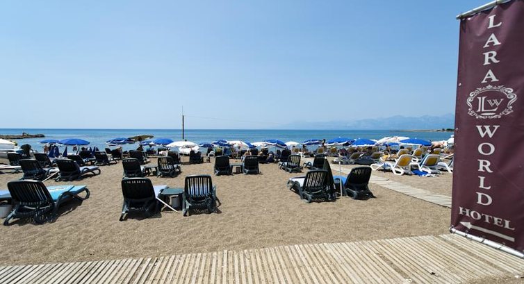 Пляж Lara World песочно- галечный, находится в 5 минутах ходьбы от отеля. Лежаки новые, не надо занимать место в 6 утра- хватит всем! В отеле выдают талончики, которые надо отдавать на пляже.