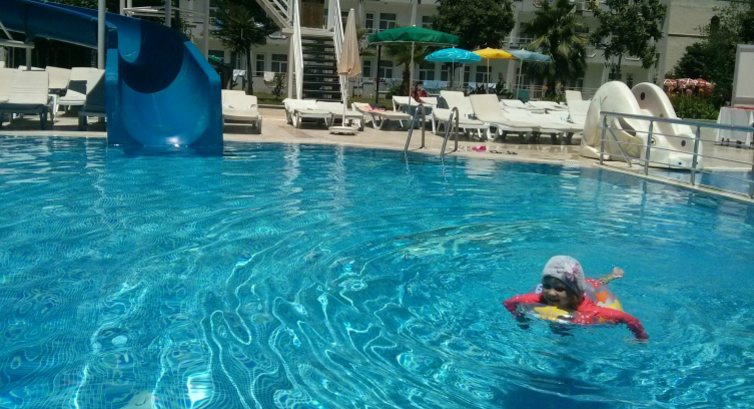 1. Об отеле: Отель на очень слабую четверку. Территории нет совсем, бассейн для взрослых очень маленький очень маленький, про детей я совсем молчу ( ванна дома больше). Есть горка - но на ней кататься не советую. За время отдыха ни разу в бассейне мы не купались. Сам бассейн расположен около ресторана - столики чуть ли не в 5 см. от бортиков, это очень неприятно как по мне. Про чистоту бассейна сказать ничего не могу. Территория не ухоженная, везде течет вода, зелени нет совсем.