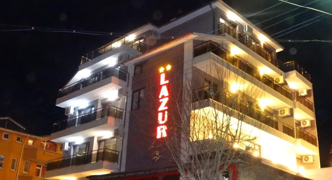 Сімейний готель «Лазур» розташований в самому центрі міста, на рівній відстані від обох пляжів (5 хвилин ходьби. Готель «Лазур» був побудований в 2000 році. У 2010 році був зроблений капітальний ремонт у всіх номерах. Готель має ресторан на 130 місць.