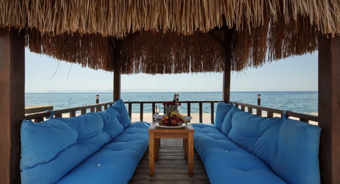 Море -- отличное прозрачное и очень чистое. Если кому-то может не понравится, то лишь по причине того, что спускаться придется с понтона. Есть малюсенький песчаный заход, но там вы наткнетесь на камни. На понтоне есть мягкие лежаки, стоят с соломенной крышей навесы. Разместиться всегда есть возможность, даже при наплыве туристов.
