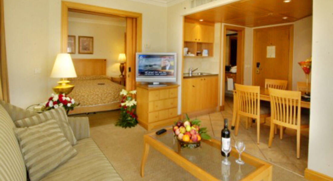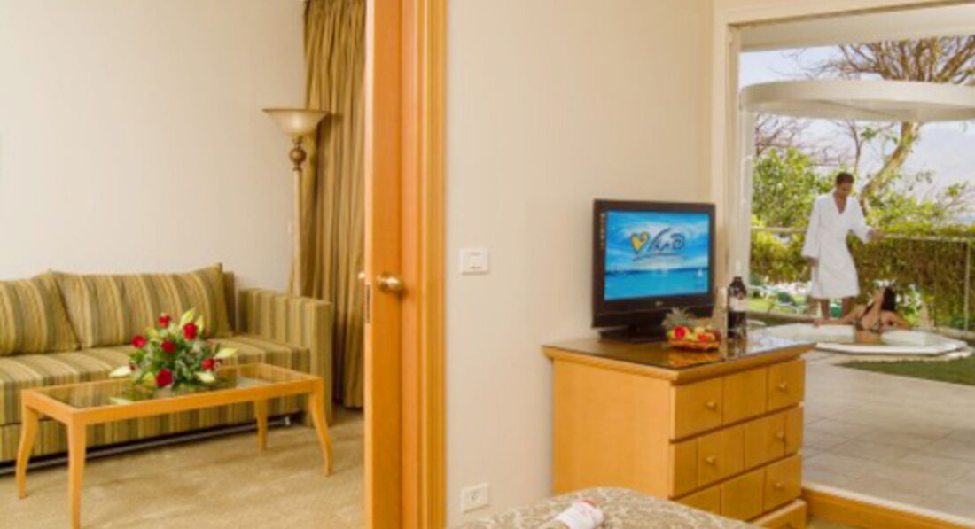 Two Bedroom Royal Suite (макс. 2+4 чол., Вітальня, 2 спальні з дверима, 2 ванні кімнати, 3 телевізори, чайний куточок);