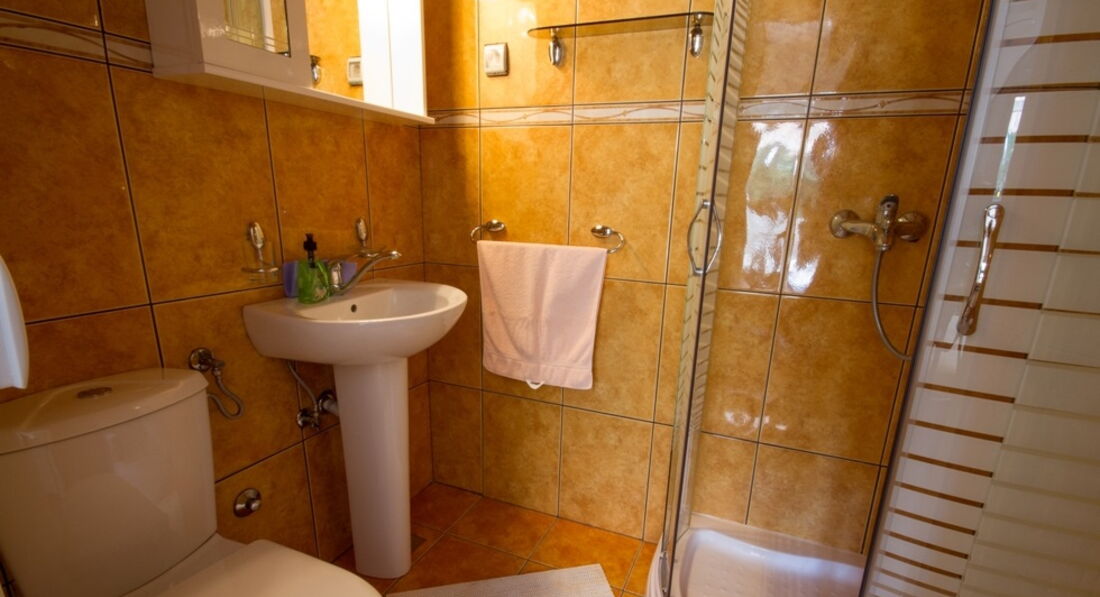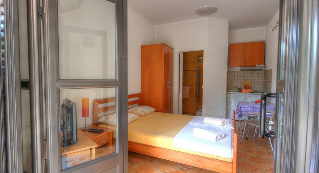 Невелика поверхова будівля для розміщення пропонує: 2 двомісні студіо на першому поверсі (вхід з тераси), 2 тримісні студіо з балконом і 1 апартамент на 6 осіб.