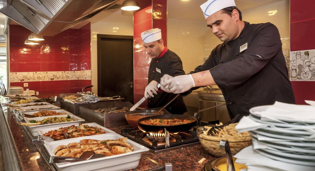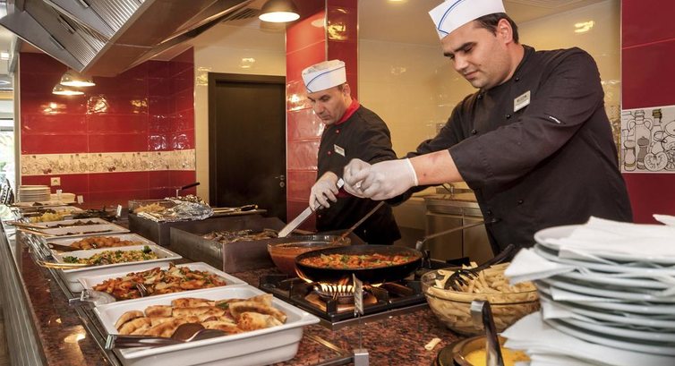 Готовят вкусно, стараются, но изо-дня в день практически одно и тоже. Завтрак: жареные сардельки, яичница, омлет, фасоль, блины, йогурты, хлопья, овощи, фруты, сок, чай, кофе, какао, молоко. Ужин: кортошка фри, пюре (резиновое, типа ролтона), плов (сочный и вкусный), куриные голени, еще раз были стейки слабой прожарки, овощи, фрукты. Но! На ужин ни чая ни сока, совсем ничего пить не предлагается. Можно взять чай за 2 лева в баре (~65 руб) или пиво/вино и т.д.