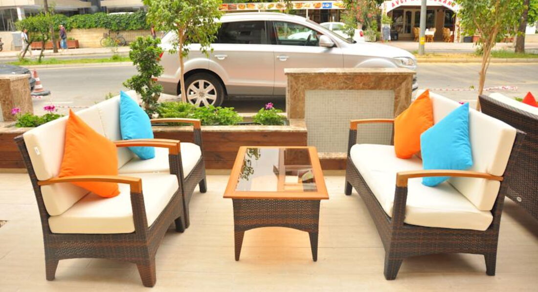 Фасадная часть отеля выходит на проезжую чать разделённую односторонним движением и газонами. Перед входом в отель имеется открытый ресторанчик и места для отдыха... в виде столиков и качелей с навесом.