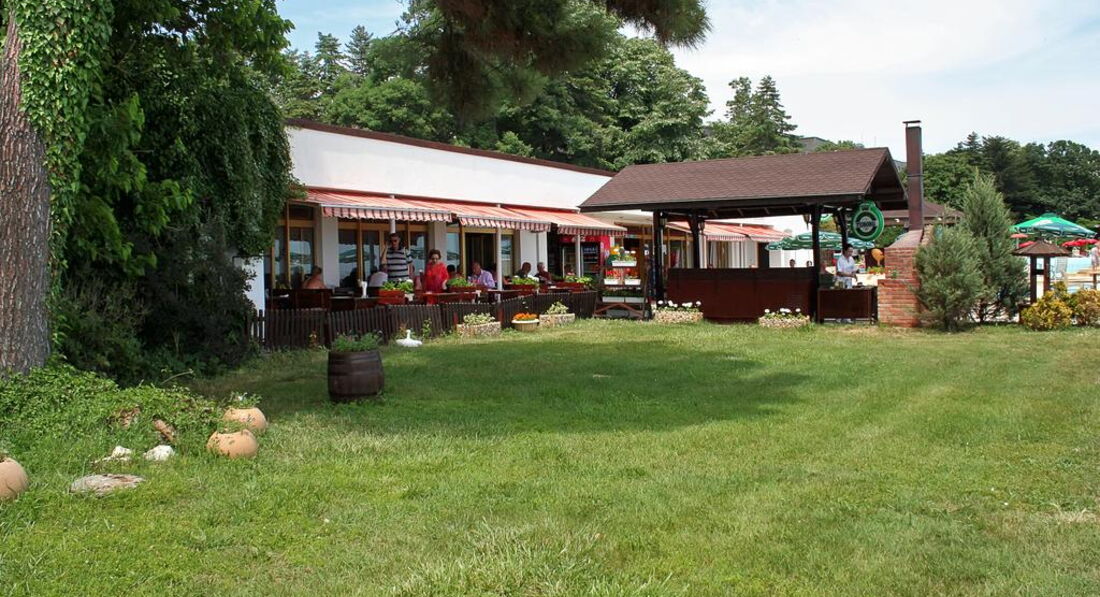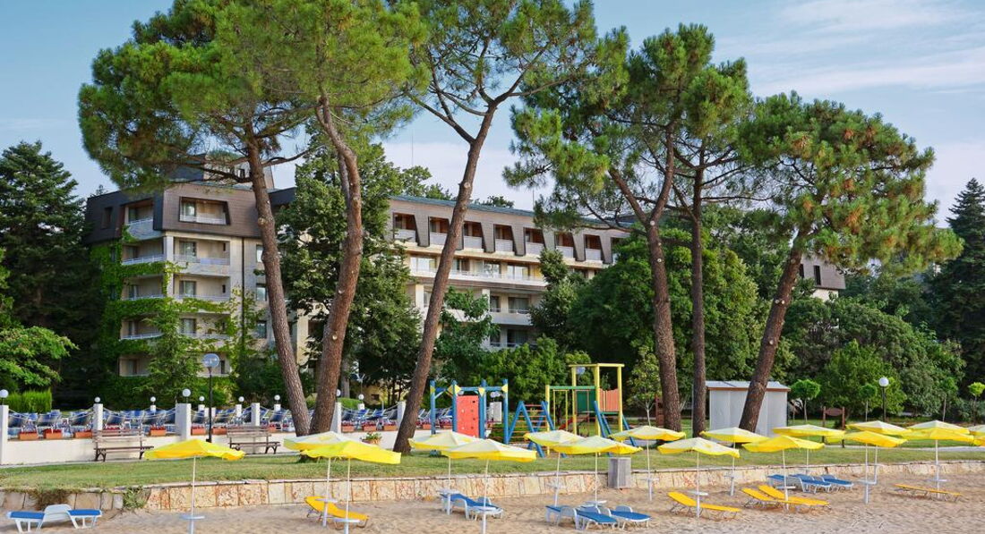 Отель находится на краю города Золотые пески, что делает возможным комфортно спокойно отдохнуть от суеты, погулять по берегу моря, посидеть на скамейке в прекрасном сосновом парке. В том случае, если хочется окунуться в атмосферу бурного праздника и мир ларьков и магазинов, достаточно пройти 300-350 метров и окажешься на набережной с барами, кафе, ресторанами и магазинами.