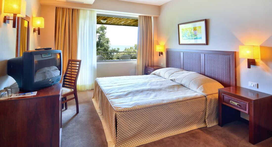 Номер: стандартный, в качестве дополнительной кровати стоит раскладушка с очень мягким матрасом, который даже под легким весом проваливается. Все номера имеют вид на море. Мы жили на 1 этаже (№112), море немного загораживали деревья, поэтому лучше брать номера повыше. Был сломан фен. Полотенец дают достаточно (также на пляже по карточкам выдают пляжные), но нет тапочек и халатов. Уборка проводится регулярно, постельное белье меняют раз в неделю.