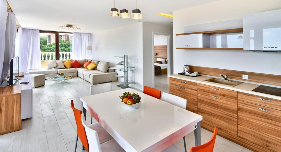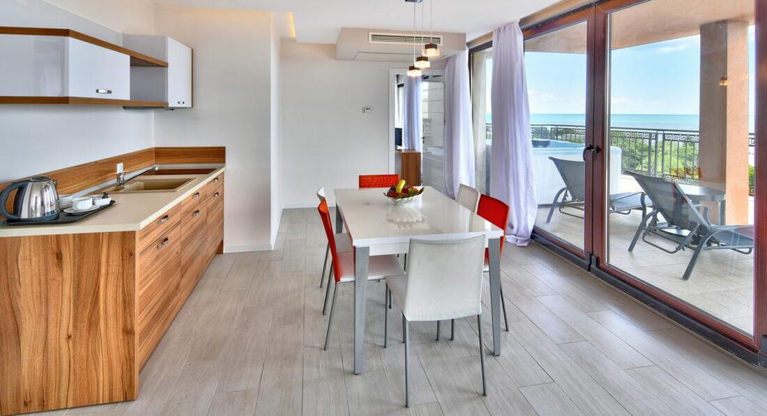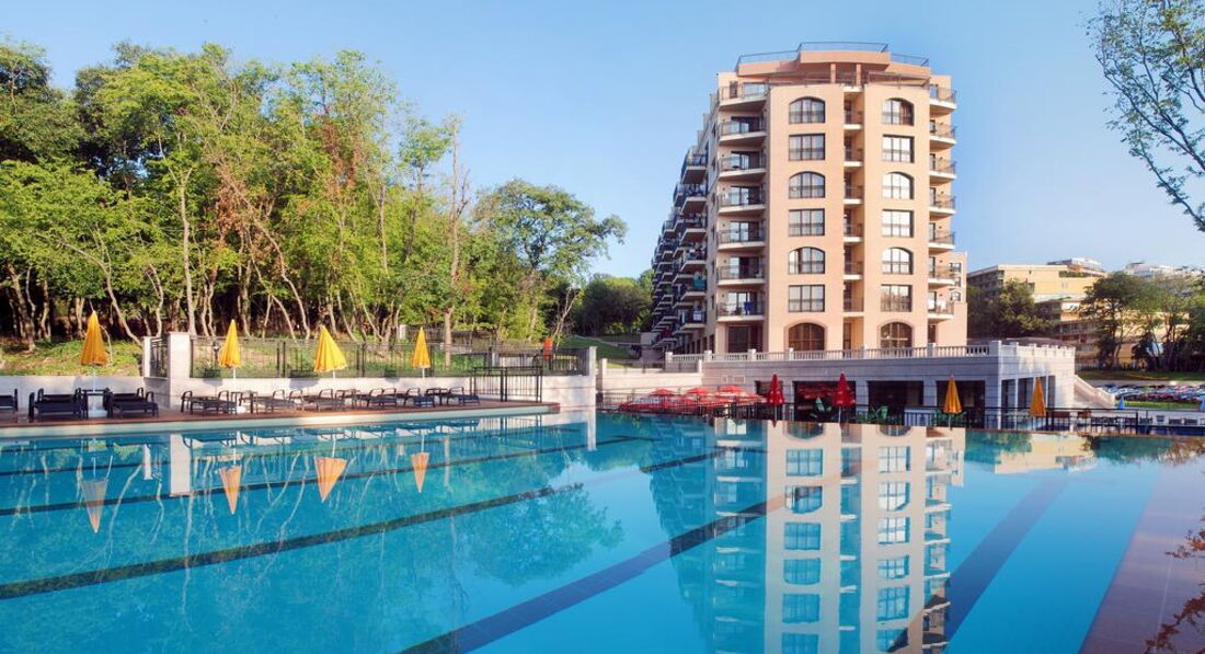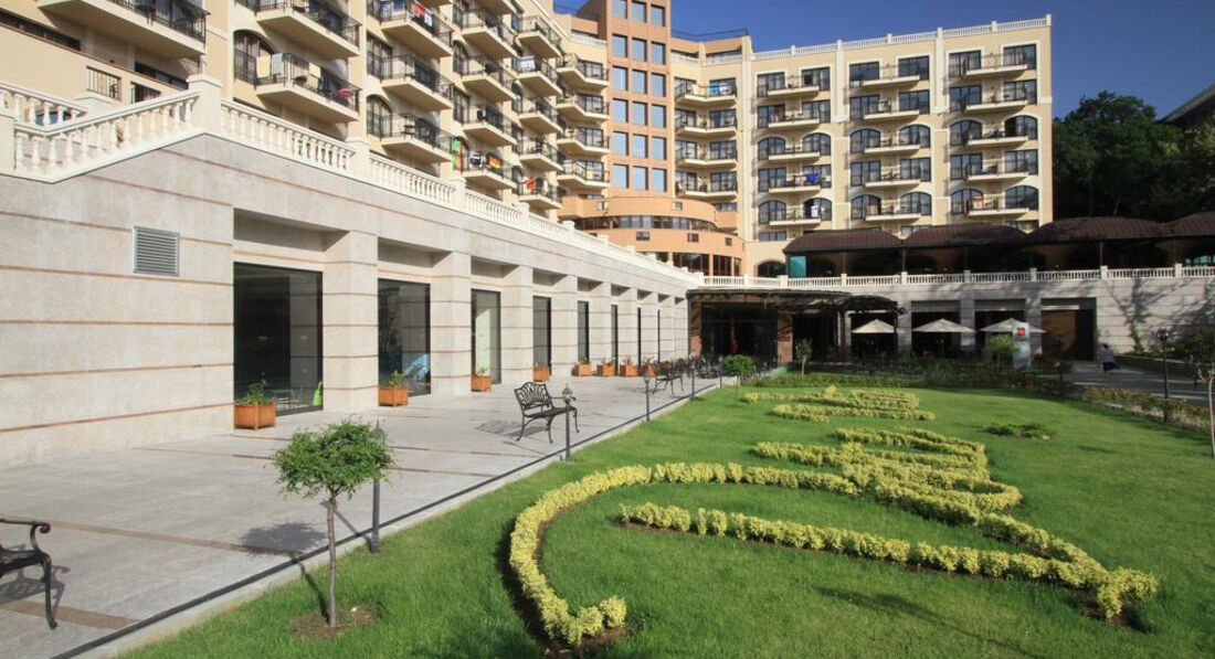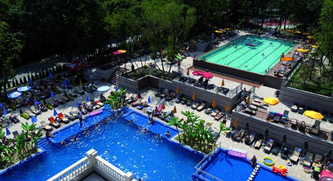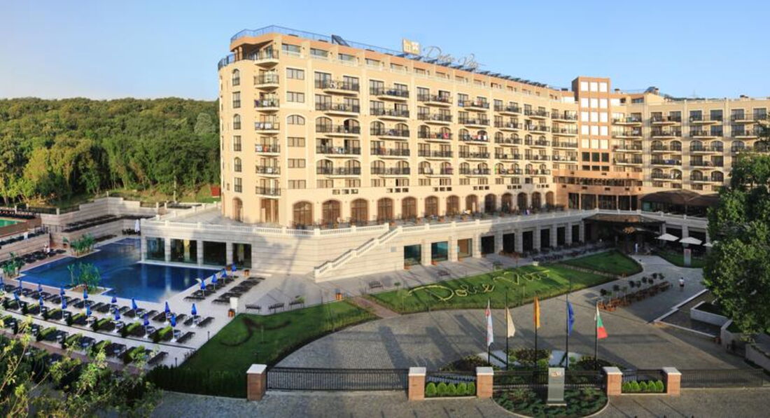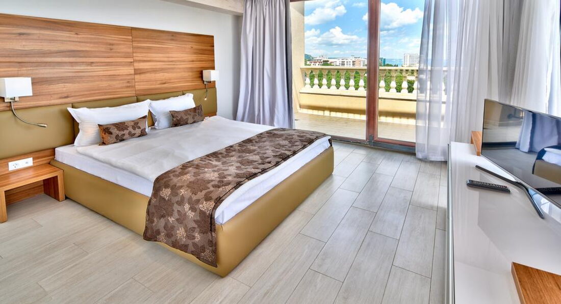 Отдыхали с семьёй, (дети 9 и 13 лет) с 28 июня по 8 июля 2017 года. В Болгарии были третий раз. Вылетали из Минска. Отель прекрасный! Понравилось абсолютно всё, и территория и размещение, и питание, и сервис. На всём курорте, действительно самый лучший отель. Так нам сказал гид тез-тура, и мы с ним согласны. Прилетели и заселились в отель в 11 часов вечера. Номер дали на первом этаже (у них первый - это на самом деле второй). Номер оказался очень просторным, с высоким потолком. Как такового балкона не было. Был выход на огороженную террасу, где стоял столик и два стула. Вид из номера был на внутренний двор отеля и бассейны. Это очень радовало, т.к. если посмотреть на номера с обратной стороны отеля, то любоваться абсолютно нечем. Деревья и дорога третьей линии. Есть минус - очень близкое расположение с соседними номерами и их обитателями. Мужу сначала не понравился этот факт, хотел из-за этого номер поменять, но я его отговорила, т.к. не знали, что может оказаться в следующем варианте, о чём потом не пожалели. На ресепшене сказали, что для нас откроют ресторан, где мы сможем покушать. В ресторане был открыт стол с лёгким "перекусом", салями, сыр, фрукты, хлеб.... вино и пиво, кому интересно тоже))) Голодными нас не оставили это было очень приятно. Что касается номеров - есть на мой взгляд ещё один "минус" - в ванной, ни в одном номере нет полотенцесушителей, и на балконах нет сушек. Полотенца, купальники, личные вещи все сушат на перилах балконов. Поэтому, подстрахуйтесь и возьмите с собой прищепки и верёвку, натянуть будет не проблема. Так сделали наши друзья, которые прилетели на три дня позже. Номер у них был на втором этаже, значительно меньше. Поэтому, если вам предложат первый этаж - вам повезло!!!