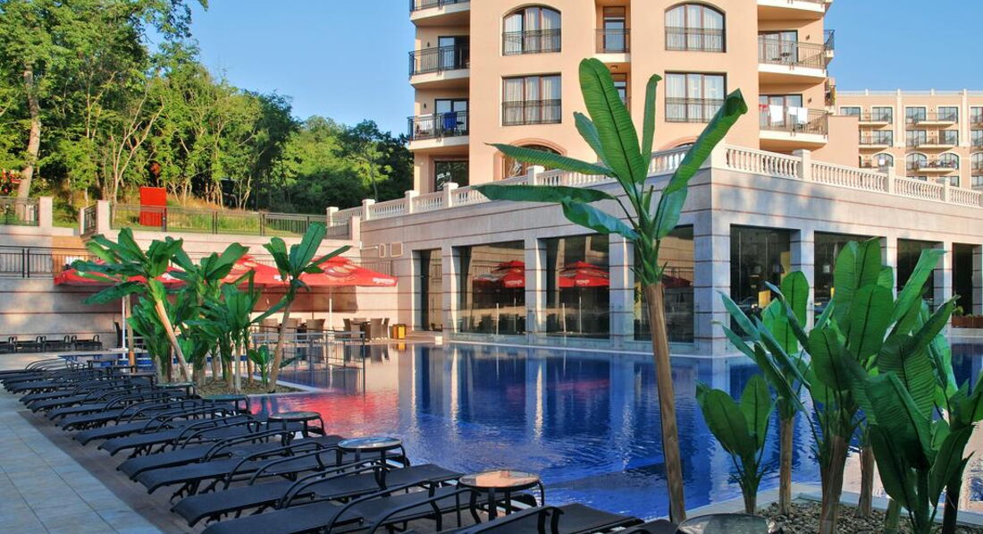 Отель хороший! Из положительных моментов: вежливый персонал, вкусная еда, никогда не было повторов. Мясо разное, овощи, фрукты и обалденно вкусные пирожные! В баре у бассейна также можно всегда перекусить, всегда есть мороженое! Отель находится недалеко от торговых рядов, так что вечерком можно прогуляться на шопинг. Из отрицательных : анимация исключительно на немецком и английском, русских вообще игнорировали пока мой муж не сказал им об этом. Стали аниматоры озвучивать анимацию и на русском! А так они молодцы, стараются. Русских в данном отеле практически нет. У отеля прям беда с лежаками у бассейна. Мы с мужем по очереди ходили в 6 часов утра занимать лежаки. Придёшь позже, уже мест нет. Нигде такого не видела, ни в одной стране!!! Еще одна беда - это платный пляж, своего у отеля нет! Предлагают воспользоваться пляжем отеля ривьера. Но туда невозможно пройти, не заплатив 30 левов за 2 лежака и один зонтик. Если идешь просто искупаться, то охранники тебя и не пустят!!! Мы с мужем были просто в шоке. И еще, как то вечером мы захотели попить утром чаю с пирожными в номере, т.к. утром рано уезжали на экскурсию. Взяли 5 штук пирожных, нас тормознули на выходе из ресторана и не разрешили их вынести !!! Мотивировали это тем, что нельзя выносить еду из ресторана, хотя немцы выносят оттуда огромными тарелками еду и никто им слова не говорит. Было очень неприятно!!! Получается, что в номере стоит чайник и чашки, но чаю попить не с чем. Зачем тогда чайник??? И вот все такие мелочи сложились в весьма негативную картину и нами было принято решение НИКОГДА больше не ехать в Болгарию! А так отель вполне приличный, если Вы - немец или англичанин! Удачи всем в выборе отеля!