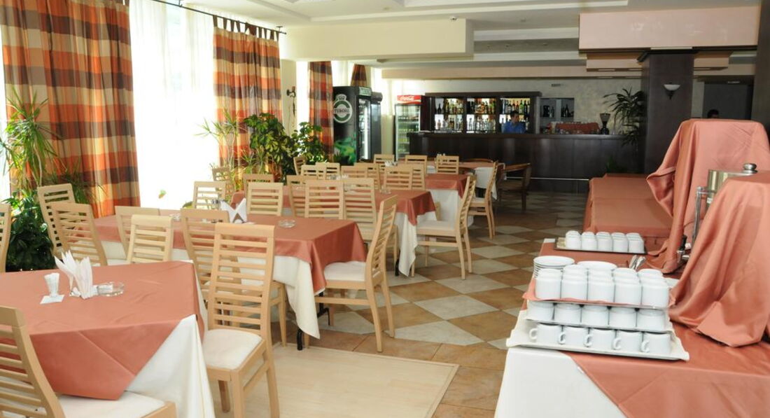 На обед и ужин дают в основном полуфабрикаты: котлеты, наггетсы, кебабы, куски курицы, картошка фри, макароны и что-нибудь плавало в соусе. В первый раз столкнулись с тем, что мармиты не подписаны. Зачем, и так понятно, что перед вами. Вино мы хуже не пробовали, полусладкий компот с посторонним привкусом, теплый, брр. На весь "ресторан" два официанта, которым надо убирать со столов, накрывать их, подносить еду. В итоге и не убрано, и не накрыто, и еда постоянно заканчивается. Кстати, разговорились с официантом, он сказал, что работает без выходных по 12 часов в день, зарплата 600 левов (300 евро). В итоге пришлось питаться на стороне, благо кафе и ресторанов вокруг огромное количество, везде все вкусно и недорого. Рекомендую Mario, оно метрах в 100 от отеля направо.
