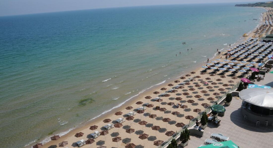 Пляж мелкий желтый песок, вход в море пологий. Комплект 2 лежака 1 зонт стоит на пляже 24лева (12,50 euro) в сутки. Есть свободная зона, где можно загорать на полотенцах. Мы покупали циновку за 5 лев и зонт за 10 лев и носили с собой на пляж.