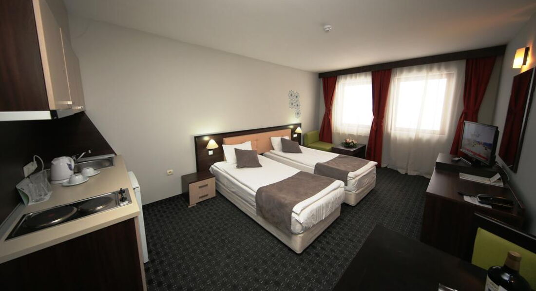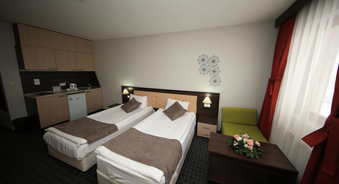 • Studio (одне приміщення з двоспальним ліжком або двома односпальними ліжками та розкладним кріслом або розкладним диваном, макс. 3 чол., 35 м2)