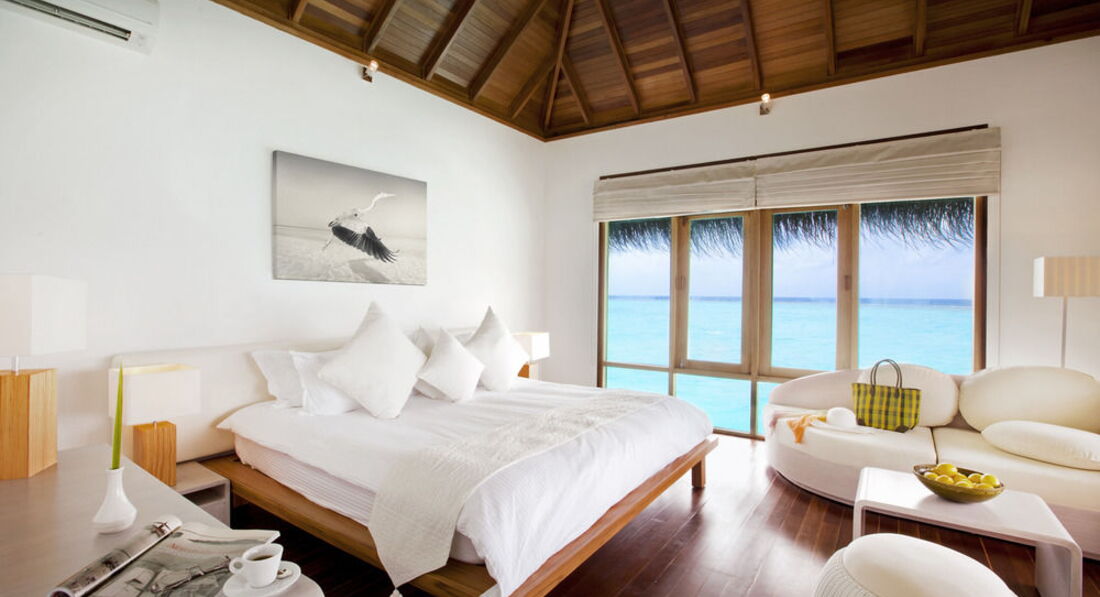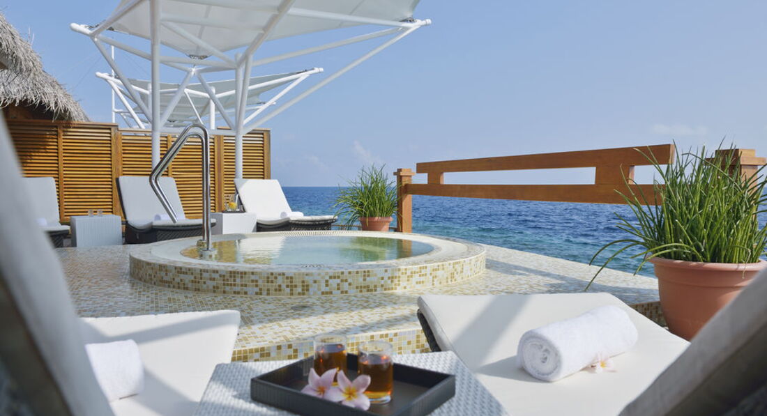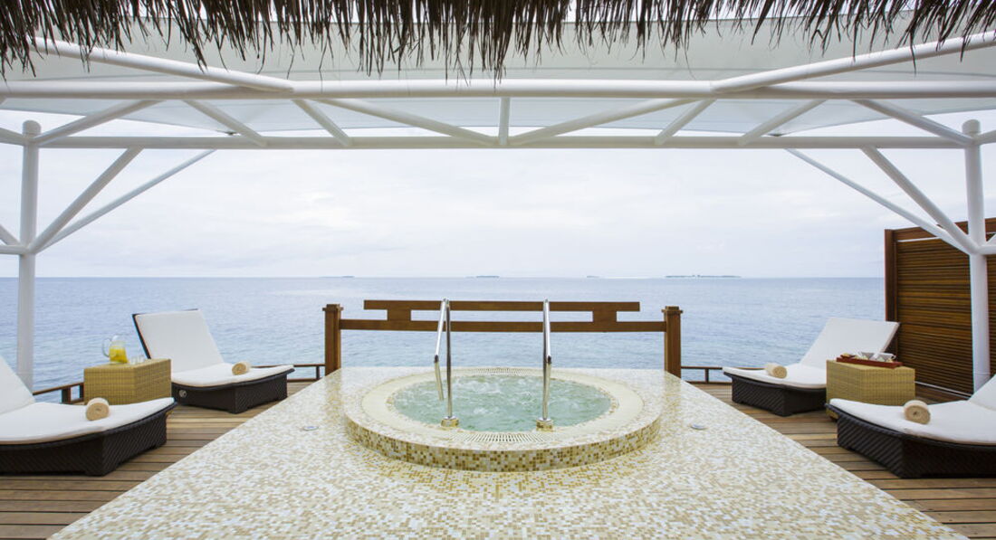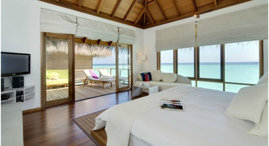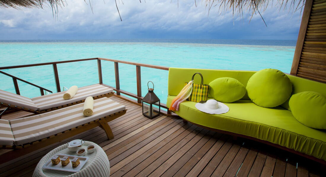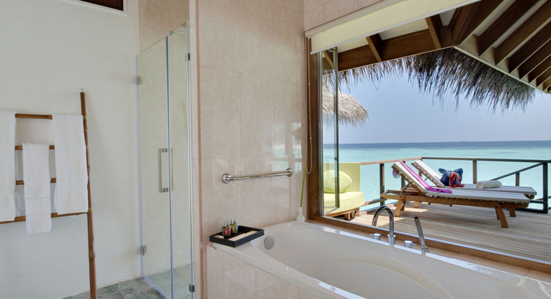 22 Water Villa (100 м2, макс. 3 або 2+1 чол.). Надводні вілли, що окремо стоять. Тераса з лежаками та прямим спуском у воду. Ванна та зливовий душ у ванній кімнаті з видом на океан.