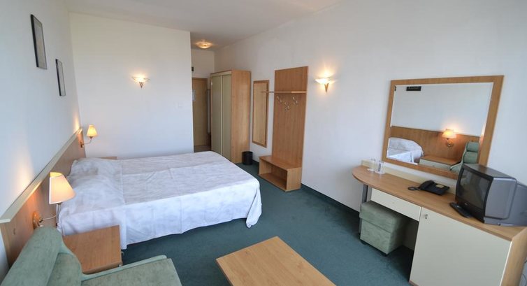 Отдыхала с дочкой 3 лет и сестрой. От аэропорта до золотых песков ехать недалеко, но наш отель оказался последним на очереди, поэтому прибыли мы на место, около полуночи, получили стандартный набор продуктов, пару кусочков соевой колбасы (она ужасна), пару ломтиков сыра (съедобно) и пару слив. Заселили нас на 4 этаж, номер с видом на море! Отлично! Нам хотелось поскорее отдохнуть с дороги, но оказалось, кресло - кровать безнадежно сломано, пришлось спускаться на ресепшен и долго (из-за трудностей языка) объяснять, что нам нужно заменить кровать, на наше счастье на месте оказался бармен Святослав, который отлично говорит на русском и кровать нам заменили. Сам номер стандартный с балконом, в номере мини-холодильник, телевизор.