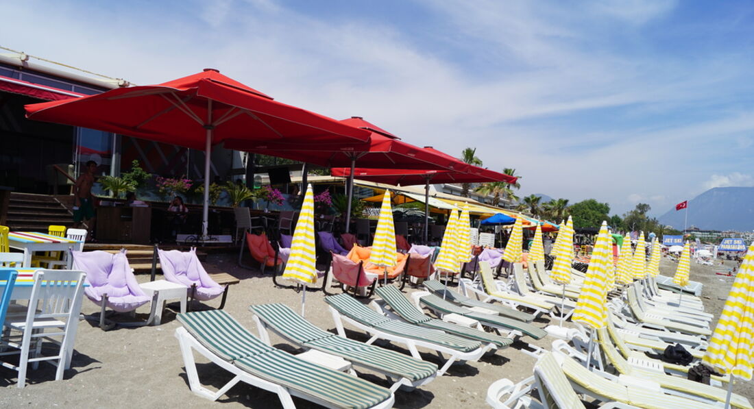 • на території пляжу є шезлонги, парасольки, бар