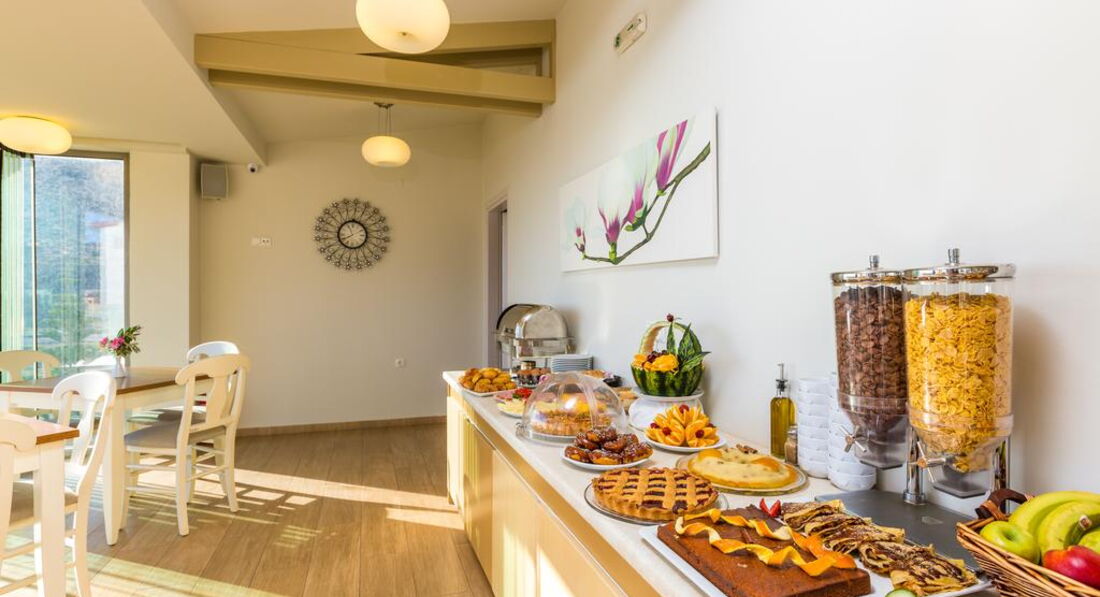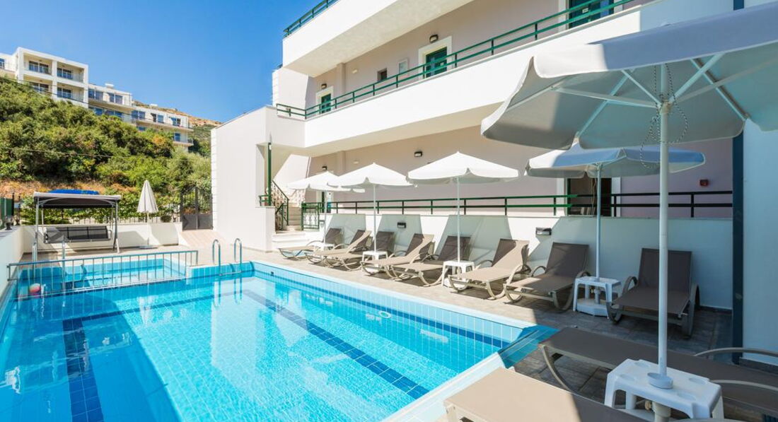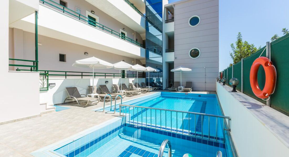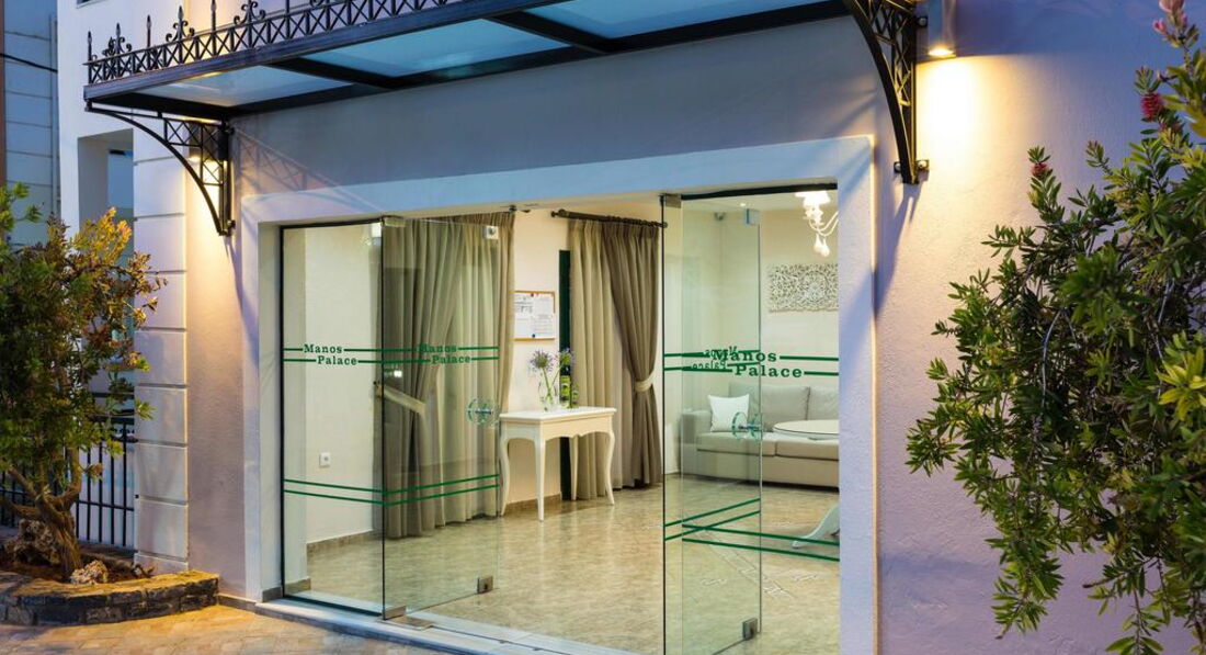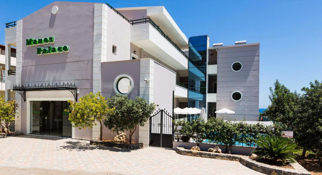 Готель Manos Palace може задовольнити потреби найвибагливіших клієнтів. Готель є двома чотириповерховими будівлями і складається зі студій і апартаментів, які оформлені в сучасному стилі, обставлені зручними меблями і обладнані всіма сучасними зручностями. В усіх номерах є телевізор, кондиціонер, безкоштовний Wi-Fi, просторі мебльовані балкони, холодильник і повністю обладнана кухня. На компактній території готелю зможуть відпочивати біля басейну, розділеного на дві частини, одна з яких призначена для дітей, для безпечного плавання. Поруч із басейном є багато лежаків із пляжними парасольками та душовими. На верхньому поверсі готелю гості можуть відвідати кафе-ресторан і насолодитися сніданком, кавою, закусками та морозивом протягом усього дня, насолоджуючись чудовим краєвидом на море. Розташований між Іракліоном і Ретімно, готель Manos Palace може стати чудовою відправною точкою для вивчення визначних пам'яток острова Крит. У 2018 році було відреставровано номери та саму будівлю готелю.