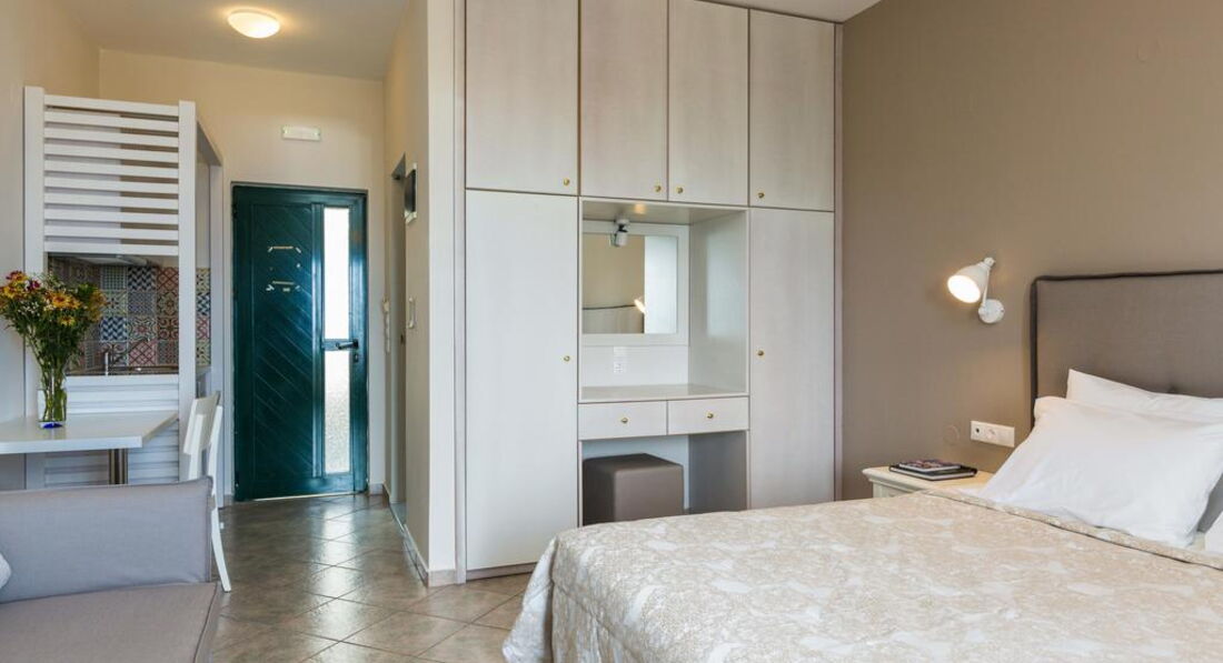 • Studio SV (вид на море, осн. ліжко – двоспальне або 2 односпальні ліжка, дод. – диван-ліжко, кухонний куточок, макс. 3 чол., 25 м2)