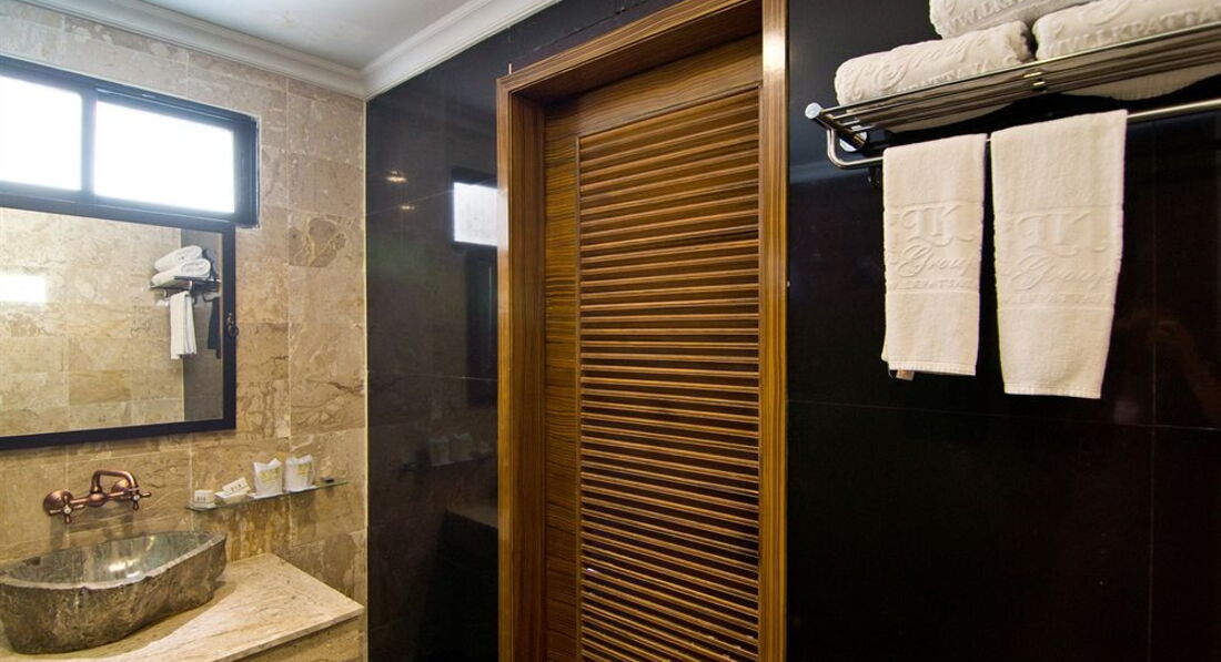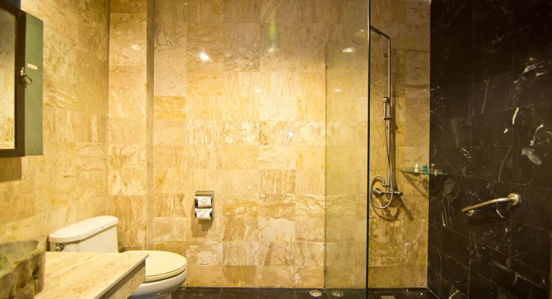 В номере есть чайник, чашки, чайные принадлежности, холодильник. Туалетную бумагу, мыло, гели пополняли регулярно по мере необходимости. Кондиционер исправно работал))) В номере плазменный телевизор, три или четыре русских канала. Мебель вся новая добротная, сантехника новая в современном стиле.