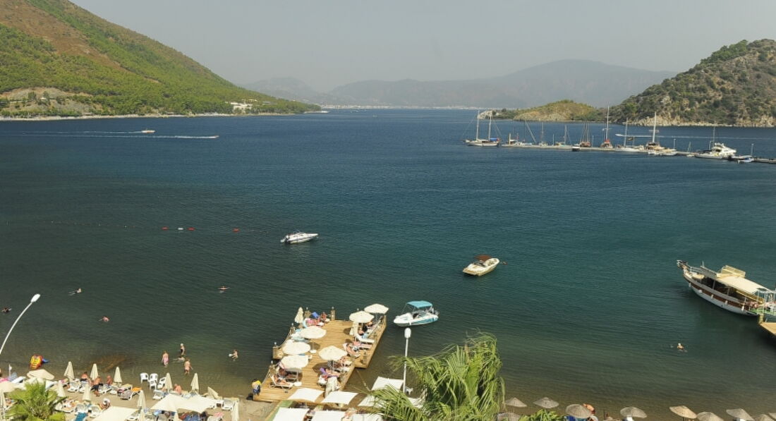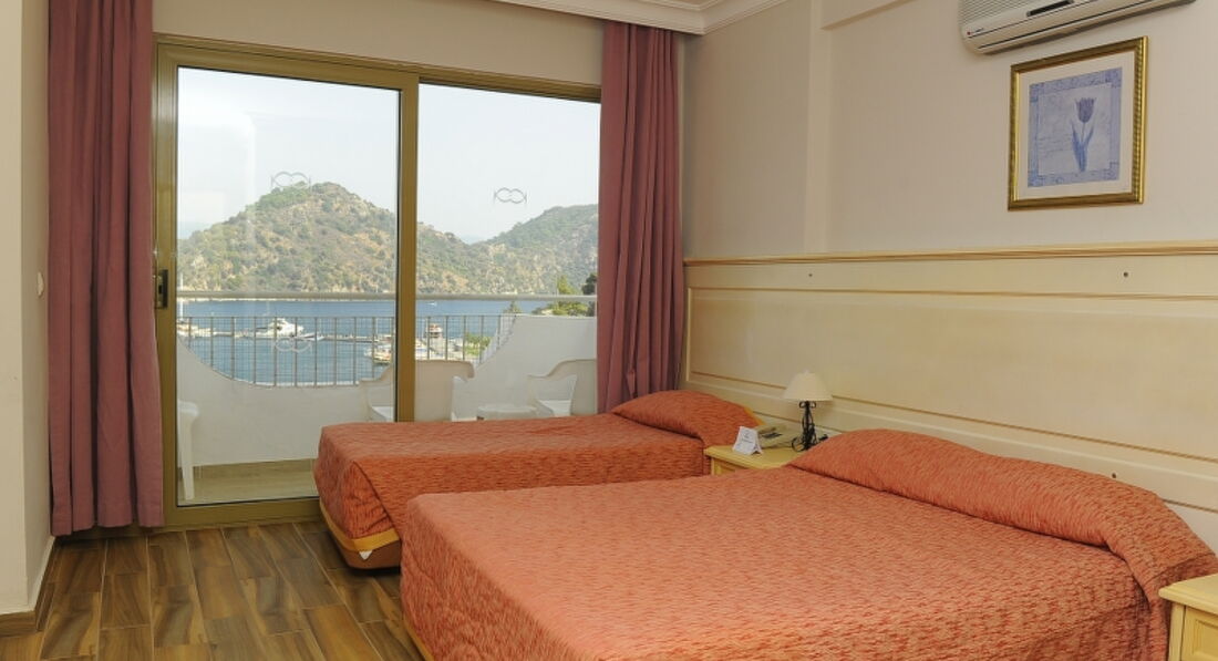 Отдыхали в конце июля 2017 г. Начну по порядку.Долго выбирали отели,чтоб была первая береговая линия,нам нужно было срочно улетать по времени,поэтому выбирали быстро.Начитавшись положительных отзывов,насмотревшись красивых фото,решили выбрать именно этот отель.Но...приехав на место,столкнулись с массой неудобств,трудностей и прочего.Ехать до отеля почти 3 часа,находится он последним,поэтому сначала всех завезли и в конце нас.Поселили нас на 5 этаже,в самом последнем номере с видом на горы,сам номер нам не понравился сразу:шкаф сломан,телевизор старый,мебель в сколах,душ течет,полотенец было всего 3 на двоих,холодильник еле работает.Решили попросить переселить нас в другой,но получили отказ,так как сказали,что занято все.Но,на самом деле номера были.Дальше,персонал не говорит по-русски,язык жестов наше все.Даже английский они не понимают.Языковой барьер присутствовал.Номера убирают плохо,и только с третьего раза как мы сказали на рецепшене что нужно прибрать.Вай фай платный.На сутки стоит 8 лир с одного человека,50 лир на неделю.Ловит плохо.Рядом на берегу есть бары,в них вай фай хороший,покупаете коктейль и вам лежак и вай фай на целый день.А так как забывают во время менять пароли,то можно пользоваться и несколько дней.Ловит на пляже.Русских мало.И отношение к русским,скажем так,не очень.Могут в твоем присутствии говорить на своем и хохотать над тобой,ты все равно ничего не понимаешь....но мы же русские,пару плохих словечек они теперь знают и на русском.Аккуратней с немцами,украинцами,одни совсем не воспринимают за людей,другие за политику.Остальные держат нейтралитет.Кондиционер работает только с 17.30 до 21.00 и с 00.00 до 6.00,в остальное время он платный,а самая жара как раз таки днем.Еда одинаковая:на завтрак,обед и ужин одно и то же каждый день.Поэтому то,что не съели в обед,будет на ужин или на след обед,или даже ужин.Из фруктов только арбуз и дыня. В баре в напитках тоже нужно выбирать.Вино разведенное и самое дешевое,водка,которую все пьют со спрайтом и она быстро заканчивается.Пиво тоже непонятное на вкус.Мы пили разные вкусные коктейли в баре :"Harmony".Лежаков на пляже не хватает,с 7 утра приходят люди,кладут полотенца и уходят,тем самым забив лежак на весь день.Заход в море песок с галькой,при входе мелкие рыбешки так и наровят укусить.Чуть глубже ныряют с маской,очень интересно,и можно увидеть много всего.Есть два бассейна,один маленький совсем,другой побольше.Но в нем разрешено плавать до 18.00.Анимации нет никакой,музыка играет через раз.С детьми здесь будет скучно.Да и молодежи здесь мало.Вечером можно прогуляться по набережной,красиво и можно найти развлечения.В центре Мармариса есть поющий фонтан.Доехать до туда стоит 3 лиры с человека на оранжевом автобусе с надписью Ичмелер.Обратно на нем же можно уехать.Мы отдыхали с Anex тур,гид Татьяна не понравилась.Информации никакой,встреча была максимум 15 мин,в основном говорила об экскурсиях.Все остальное мы узнали от других отдыхающих.Отель не соответствует 3+,плохая 3.Мы знали,что едем не 5*,но элементарно убираться нужно,и чтоб все исправно работало.Честно сказать,больше не приедем в этот отель.Единственный плюс,это расположение пляжа и море.Развлекались сами.Да и брать все включено,я думаю,нет смысла.Еда надоест,а тут много ресторанчиков,где можно вкусно и разнообразно поесть.Отель на 3.Ед