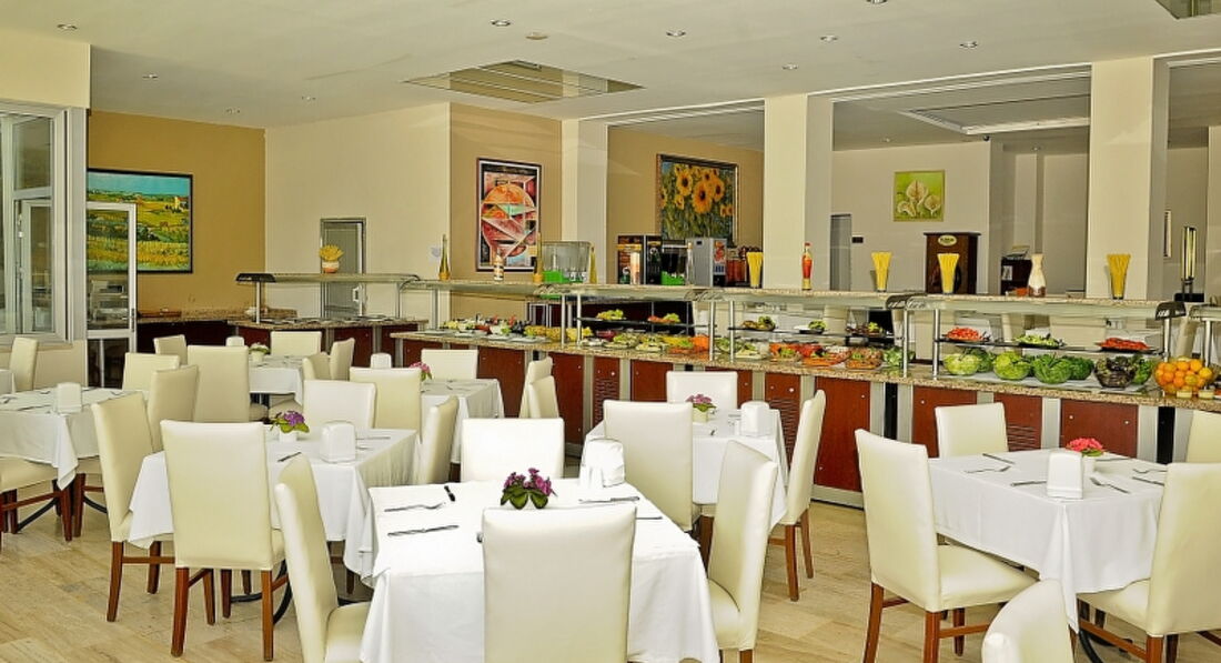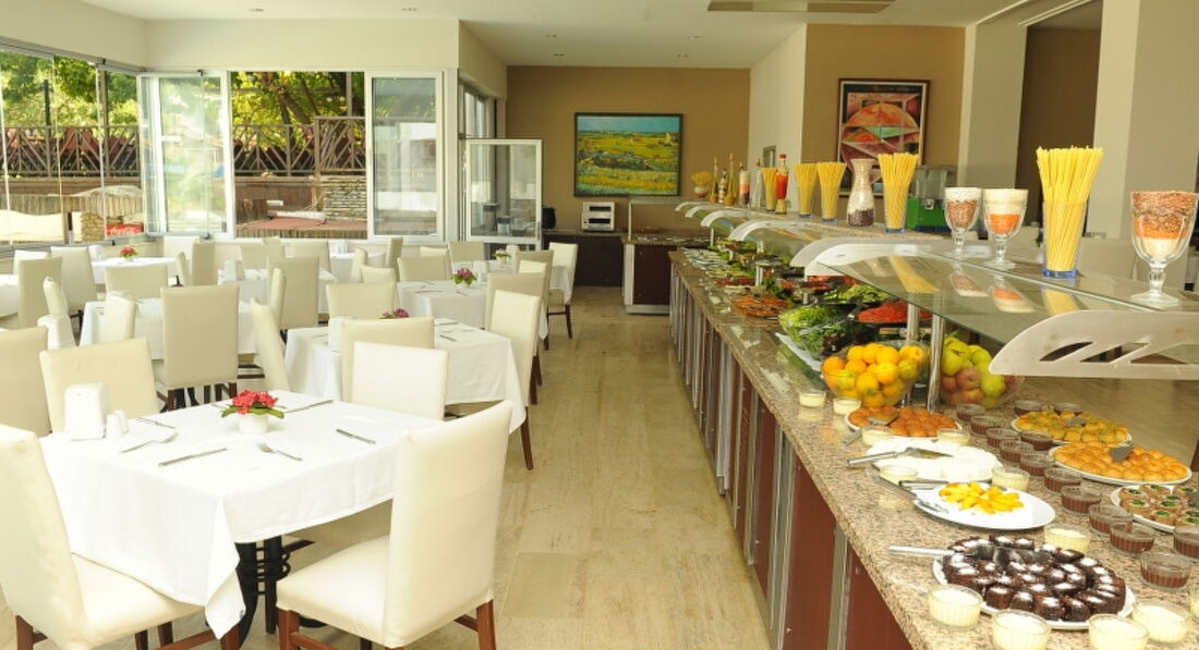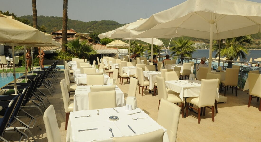 Месторасположение очень удачное для тех, кто любит тишину и уют- в самом конце променада. В окружении гор, так что с одной стороны нет палящего солнца. Вечером, если захочется отдохнуть не беспокоит музыка со стороны и снующие вокруг толпы. Для меня, желающей отдохнуть от массового скопления людей- самое то было. Боялась, что дети не оценят, но и они, съездив в центр Мармариса вынесли вердикт "Там жить нельзя, это Тверская! Как хорошо у нас!" Немного не хватало музыкального сопровождения, тихой музыки ненавязчивой в зоне у бассейнов , хотя бы вечером, или во время обеда-ужина... многие уделяют внимание еде: нас все устроило, но мы непритязательны. Завтрак: несколько видов корнфлекса, омлет, оладьи, несколько видов оливок, сыра, зелени, варенья- всегда можно выбрать на свой вкус. Завтрак долгий, с 7 до 10-30, так что я успевала утром искупаться, поесть оладушек с вареньем с чаем, позагорать, искупаться еще несколько раз и к 10 подойти и съесть еще пару кусочков сыра с зеленью и оливками! На обед, правда только 1 вид супа в день. Все супы типа "пюре", своеобразные, но съедобные. На гарнир всегда был рис ( вкусный очень), картошка фри, несколько раз фасоль (зеленая, и обычная) Картофель в сливочном соусе, пюре, цветная капуста, макароны "по-флотски", макароны с морепродуктами в сливочном и томатном соусах, что-то еще, все не вспомню. Мясо всегда 2-х видов. Чаще всего- курица и индейка. Но помню и оладьи печеночные, и говядину и кебабы. Да и курица с индейкой были постоянно новым способом приготовлены и все очень достойно. Вечером- всегда овощи гриль и мясо или рыба на гриле. Рыба была и на обед пару раз, но мелкая и костлявая- нас не впечатлила). Зелень разного вида всегда, несколько видов салатов. Сладкое наверное видов 6-10 попеременно, немного однообразно, но что-то выбрать всегда можно. Очень вкусный и качественный чай даже для притязательных чаеманов всегда в доступе, что немаловажно! Кофе неплохой, но с чаем не сравнить. Соки типа "юпи", но покачественней чуток всегда в доступе ( что важно- мой гастрит их воспринимал спокойно, если я нарушала ;) ) Вот выпивка в баре ужастна... Вино ВСЕГДА теплое и низкого качества ( из какой-бы бутылки Вам не наливали). Коктейли- ерунда, что ром, что виски...водку не пробовала. Из алкоголя только пиво- хорошее. В номерах на верхнем этаже жильцы жаловались на то, что кончается вода вечером в душе. Не знаю, решалась ли эта проблема и как. "Общая система кондиционирования"- обещаная по времени во второй половине дня и на ночь мной в принципе не ощущалась, но знаю тех, кого устраивала. Я предпочла доплатить и получить индивидуальный кондиционер, с которым комфортно. Платила дополнительно так же за вай-фай... У меня же 2 подростка... но это беда: тут не ловит, там не ловит, связь рвется, постоянно требует перезагрузить и ввести пароль. Нервотрепка. Если нужно для работы- не вариант. Для соцсетей подростковых даже хорошо было: дочь плюнула и не пользовалась, да и сын больше времени провел в реале. Отношение персонала дружелюбное, корректное. все проблемы, с которыми мы обращались, решались сразу, никто не вымогал денег, не делал вид, что не понимает русского ( я, конечно, старалась объясняться на английском, но не всегда могла). Постояльцы из разных стран: немцы, англичане, португальцы, турки, украинцы и русские в большом количестве. Обстановка дружелюбная и 