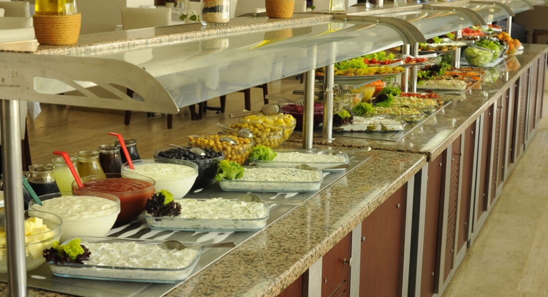 Питание вполне приличное для тройки, система шведский стол на завтрак, обед и ужин. На завтрак давали омлет, оладьи, печеные томаты с сыром, вареные яйца, сосиски, колбасы, шесть видов сыров, сухие завтраки, всегда было молоко, овощи, салаты, зелень: руккола, лист салата разных видов, петрушка, соленья, разные варенья, мед, безумно вкусный хлеб, кофе был из автомата, довольно вкусный, чай и соки. На обед и ужин давали крупы, печеные овощи, макаронные изделия, всегда была курица или говядина, разные салаты, овощи, зелен, много сладостей, иногда были торты. На ужин всегда жарили овощи (лук, перец, томаты) и мясо на гриле, преимущественно курицу.