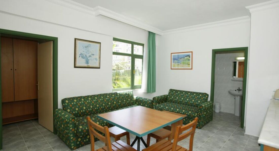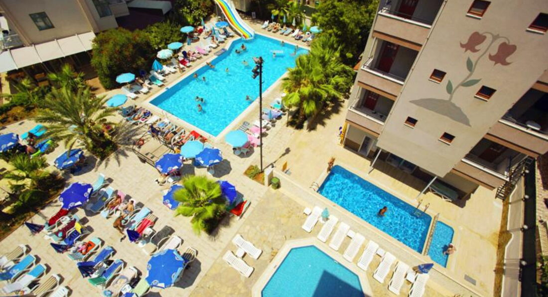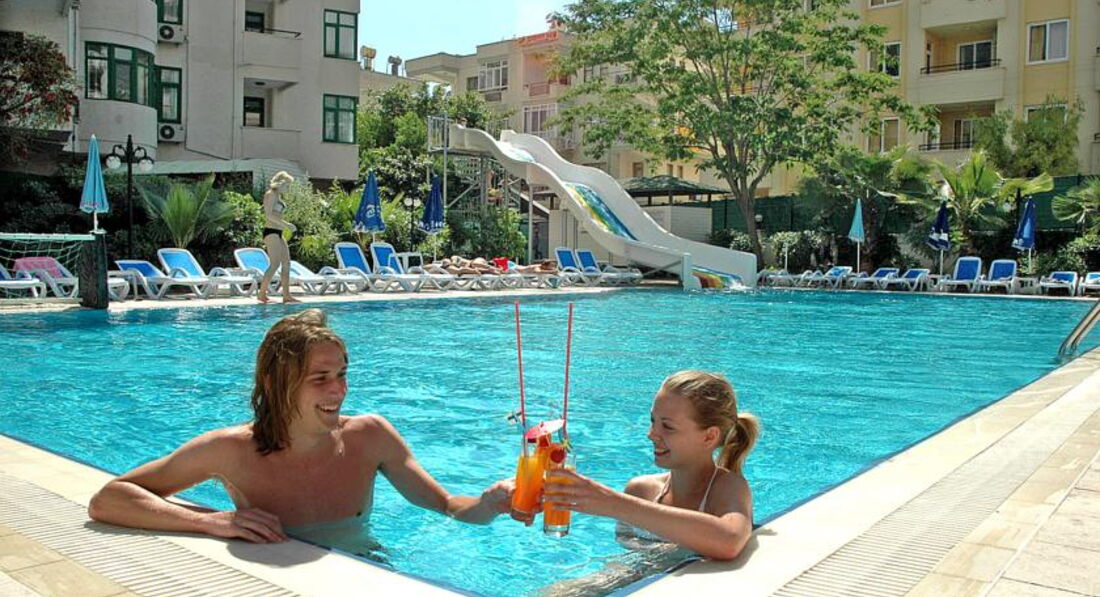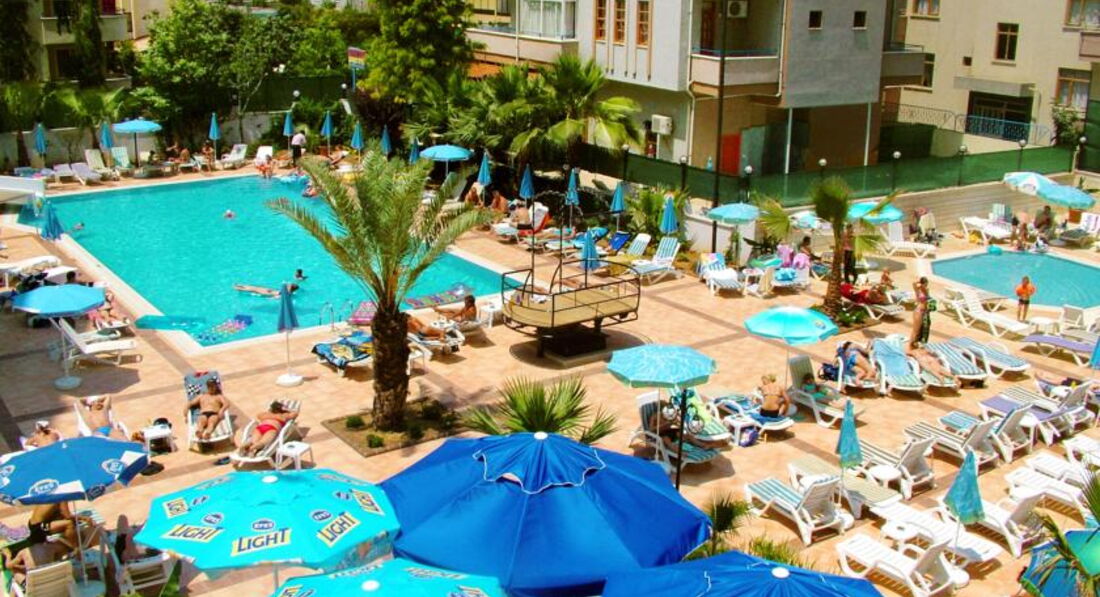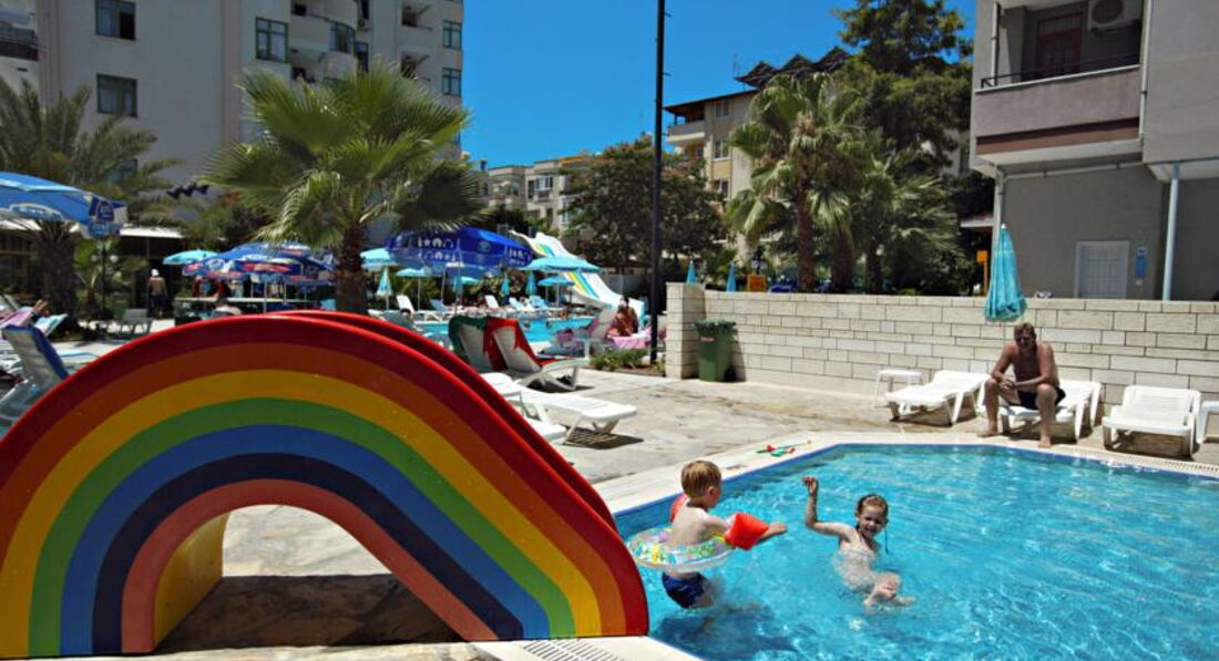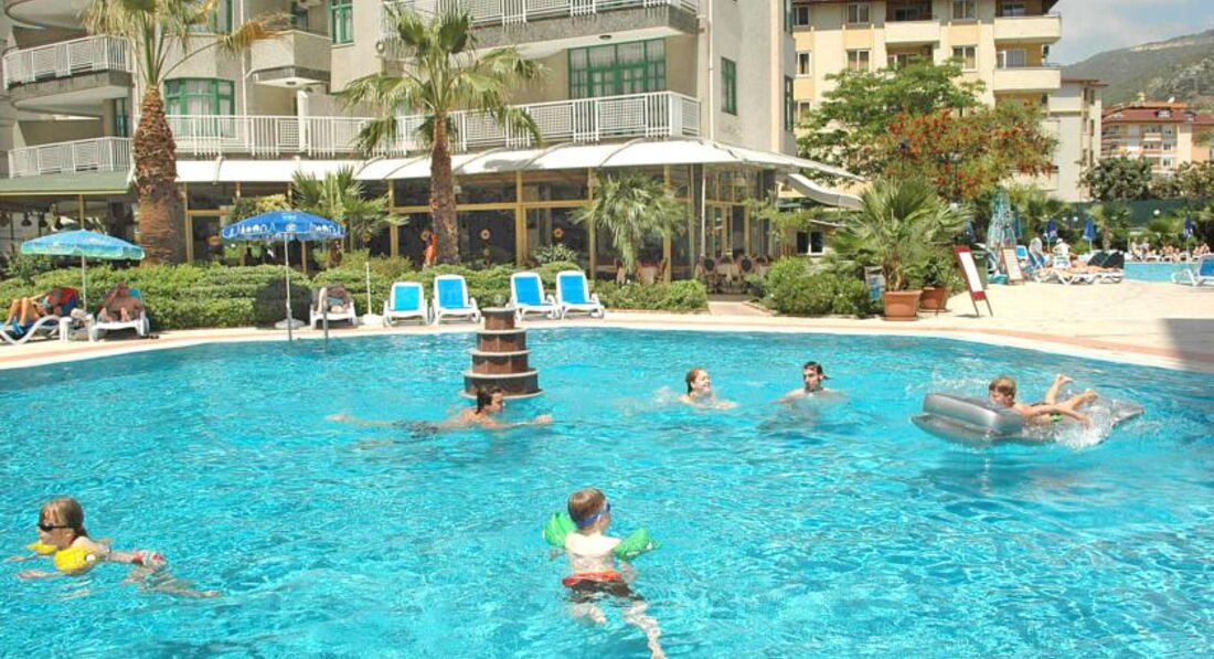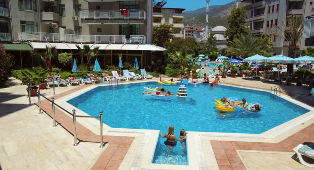 Отдыхали в августе 2015, только прилетели, отель хороший, семейный, но очень скучный. Номер у нас был с видом на бассейны, балкон большой, танцевать можно, без шезлонгов, стол и 4 стула. Номер двухкомнатный, на мой взгляд скромненько, но чистенько, с кухней и полным набором посуды, чайник, тостер, плитка соковыжималка, и т.д. (это наверно для зимующих немцев и тех кто без питания едет) свет, сантехника, все работает, все подкрашено, подшпаклевано, постельное белье и полотенца новые, с отметкой названия отеля и года производства на бирке))), убирались у нас нормально, мусор везде выбрасывали))) Кондиционер только в одной комнате! поэтому вся семья в нее постепенно и съехала. Питание отличное, рыба, мясо, курица, овощи, пиццы и запеченые баклажаны и кабачки, выбор может и не очень большой, но все вкусное, на ужин всегда барбекю. С фруктами хуже: арбуз, апельсины ,дыня, сливы и яблоки. На сладкое мы не налегали, тортики и пироженки на каждый день не для нас. Деткам с 16 до 17 - мороженное, но строго по стаканчику на ребенка. Карточная система наливайка - это отдельный прикол, на второй-третий подход смотреть начинают косо, но количество алкоголя потребляемое сильным полом нашей семьи без видимых внешних проявлений потрясло в итоге местных барменов, потом они привыкли, и наливали спокойно. Но таскать с собой карточку, для каждого подхода к бару - оччень напрягает. Банные принадлежности берите с собой, в номере вас ждет один кусочек мыла на всех. Нам очень не хватало детской анимации. Дети в отеле в основном скучали, играли в догонялки, что по кафельной плитке вокруг бассейнов, не самое безопасное занятие. Мы ехали в городской отель в расчете на то, что будем в основном гулять по Алании, но в августе это невозможно, очень жарко. Бассейны по всей территории, в общем пять маленьких бассейнов. Шезлонгов всегда хватало, и всегда (кроме 12 часов) можно было найти место в бассейне в тенечке. До пляжа 10 - 15 минут, пешком, с детьми, неспешно. Трансфером мы не пользовались. Пляж очень широкий, песочек отличный, водичка чистая, душ, переодевалки, туалет - все есть. Магазинов вокруг полно. Дамталаш - минут 20 от отеля, взрослый билет 5 лир., дети - бесплатно, крепость - 15 лир., наверх на автобусе (вот на автобусе билеты одинаково и на взрослого, и на детей - 2 лиры) , вниз - пешком, мы ушли в сторону красной башни. Виды вокруг потрясающие. Красная башня+ Терсане взр 10 лир, дети как везде - бесплатно. Аквапарк минут 10-15 от отеля, взр. 40 лир. детский билет -20 лир. Кстати, когда море штормит, тем кто с маленькими детками можно купаться у красной башни ,там волны нет и достаточно мелко у берега.