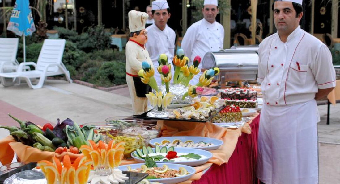 2.Питание. К чему нет претензий совсем, так это к еде. Всегда все свежее-овощи, зелень (руккола, салат, петрушка-тазами), 3-4 вида мясного и рыбы (чаще - курица, индейка, жареная камбала),но была и говядина, и вкусные котлеты, не соевые; несколько видов гарнира(рис, булгур, спагетти, картошка, по-разному приготовленная).На территории несколько кофейных аппаратов, всегда есть чай. Сладости очень вкусные- торты, пирожные, панакота. Мы остались довольны. На завтрак всегда жарят свежие блинчики, и по заказу омлет. На обед и ужин-обслуживание за столами - приносят напитки и забирают грязную посуду. Алкоголь с 10.00 до 23.00 наливают в баре у бассейна, алкоголь как и везде-пиво, раки, вино (я пробовала лишь первые два- не отравилась), за деньги делают разные коктейли.