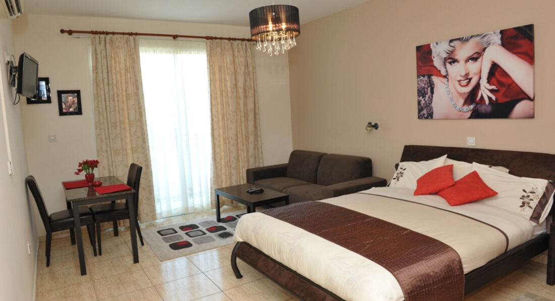 Deluxe Studio (45 м2). Кімнати у номері: спальня. Ліжка: 1 двоспальне. У ванній кімнаті є ванна або душ. Фен: на запит. Сейф – 5 євро/тиждень.