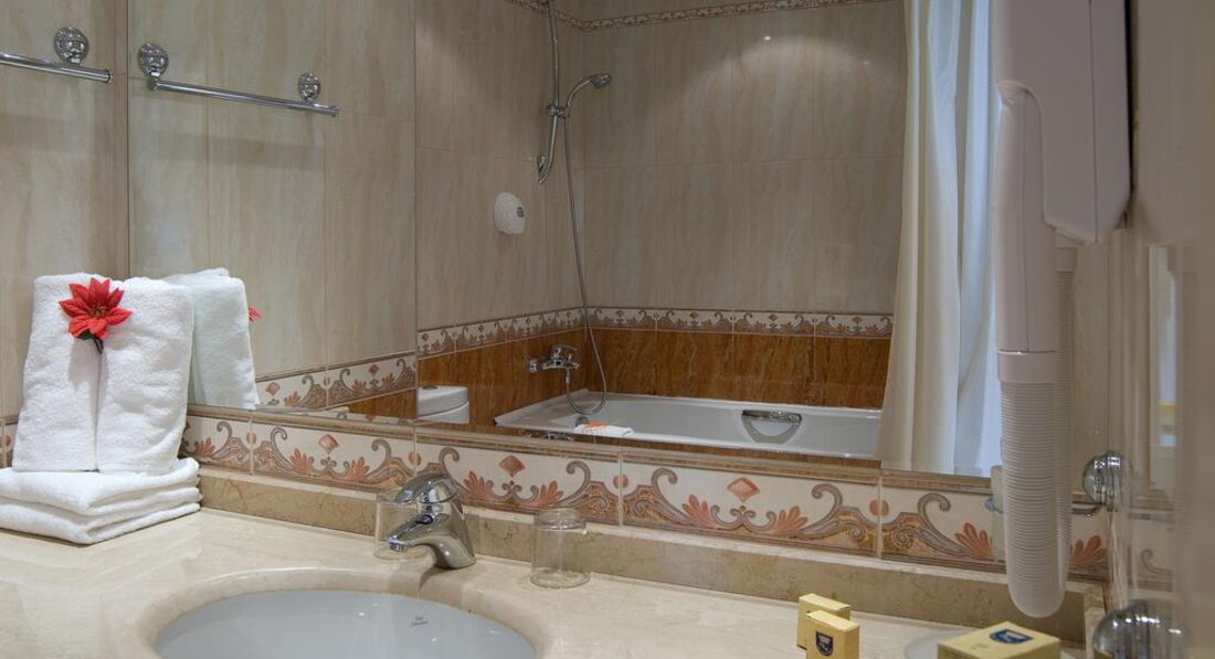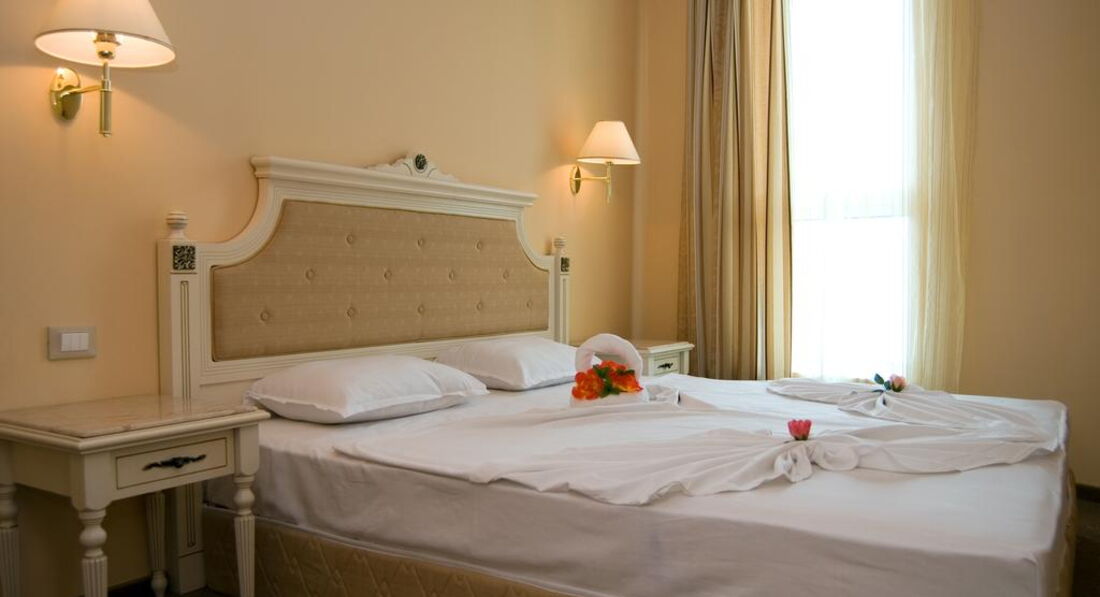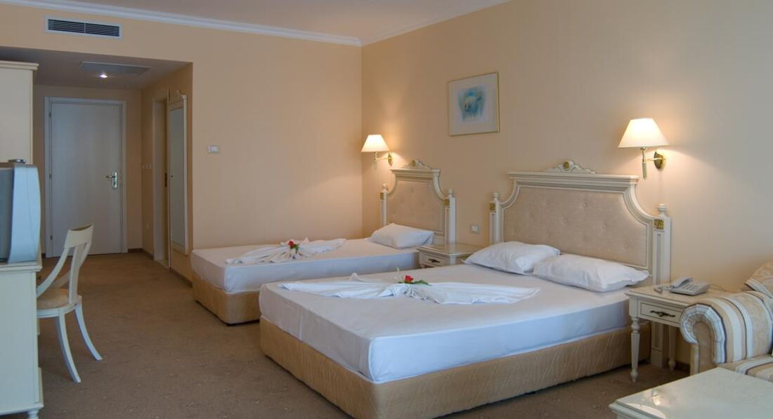 Номер - ну..как номер, ничего выдающегося. Кровати пришлось сдвигать (стояли изначально как две отдельные), раскладное кресло-кровать для старшего ребенка мне показалось неудобным, для младшего ребенка была кровать-манеж, но мы ей ни разу не воспользовались. Санузел нормальный, душевая лейка немного подтекала, фен неудобный и очень быстро нагревается. Вид из номера был на "парк", а до парка дорога и под самым окном огромный шумный тополь, но при этом кусочек моря был виден и слышен его шум по ночам. Номер был на 4 этаже, не сказала бы, чтобы было шумно, ночью все время спали с открытым окном. Кондиционер работал хорошо, но пользовались им всего пару раз. Видела вид из окна на море - красота :), но перед морем там лобби бар и бассейн, так что тоже может быть шумно.