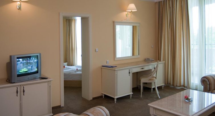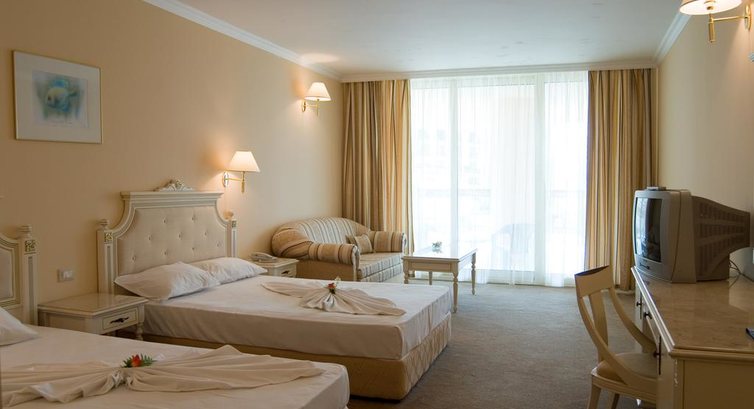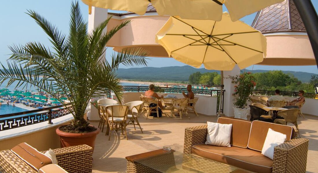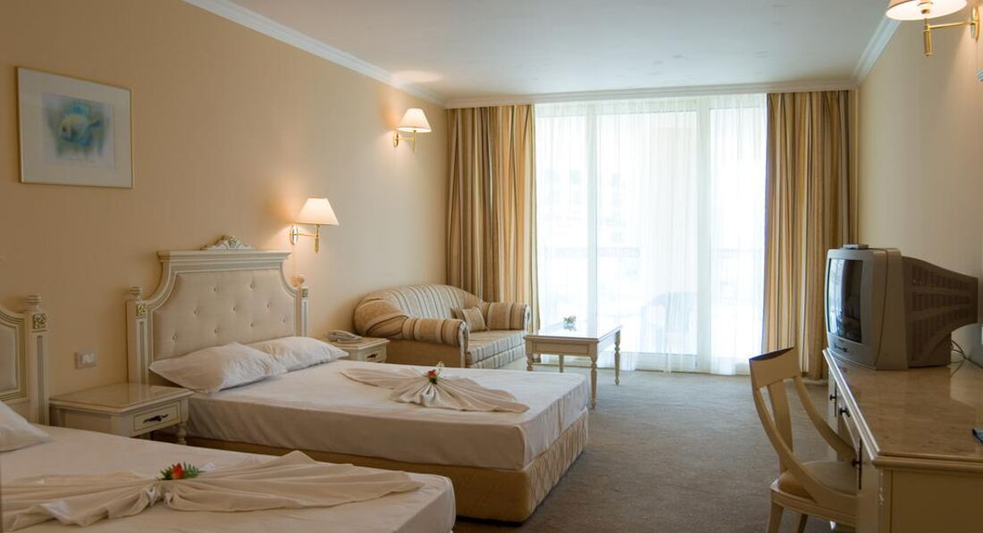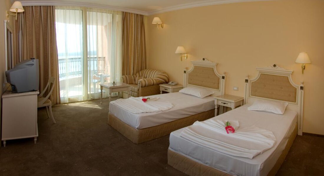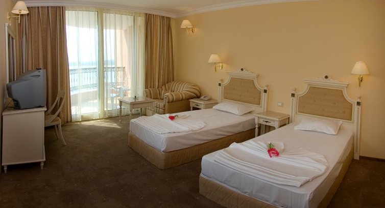 Поздно вечером на какнуне отъезда обнаружили что наш рейс перенесен на более позднее время и нам понадобится номер чтобы с комфортом провести еще один день в отеле. Обратившись с просьбой продлить аренду номера на ресепшн -девушка объяснила, что наши номера уже забронированы под слеющих постояльцев и продлить проживание в них нельзя, но сказала что утром придёт её начальник и постарается решить вопрос. В результате на утро нам предложили перебраться в другой номер - что мы и сделали оплатив 50 лев - номер был не очень в плане расположения и вида, хотя опять же чистый и комфортный и вполне подходящий как склад для чемоданов, чтобы полежали до вечернего самолёта, а в нашем распоряжении также остался весь набор услуг, пляж, море, отличная погода и настроение. Если хотите продлить бронь своего номера - позаботьтесь об этом как можно заранее. В общем в каждом отеле имеются не очень выигрышные номера - на мой вгляд в этом отеле к таковым можно отнести номера из из тех, что с видом на море, балконы которых расположены в непосредственной близости к ресторанной терассе и нормера на первом этаже, а с другой стороны здания номера 1-2 этажей (панорамного вида на гору из них не будет, зато под балконами иногда будут проезжать авто, обслуживающие отель.) Справедливости ради стоит отметить, что в данном отеле стараются инзначально разместить людей в наиболее комфортные условия, а остальное держат как резерв для тех кому напрмер надо где-то скоротать время до задерживающегося самолёта (может и ошибаюсь, но так показалось). Для сравнения в нашей практике зачастую было наноборот - изначально предлагают номер похуже, чтобы за деньги потом "решить" проблему. Возможно последнее обстоятельство часто было обусловлено методом работы туроператоров - которые в отелях выкупают за минимум денег просто "места" без гарантированных параметров и с людей по приезду менеджмет отеля уже срубает денег за номральные условия.