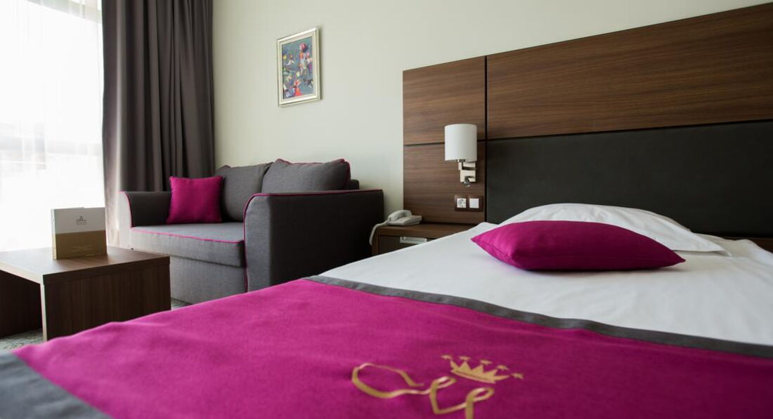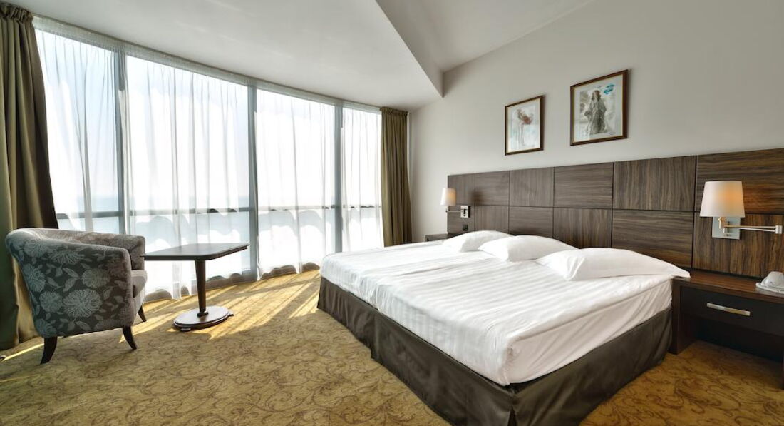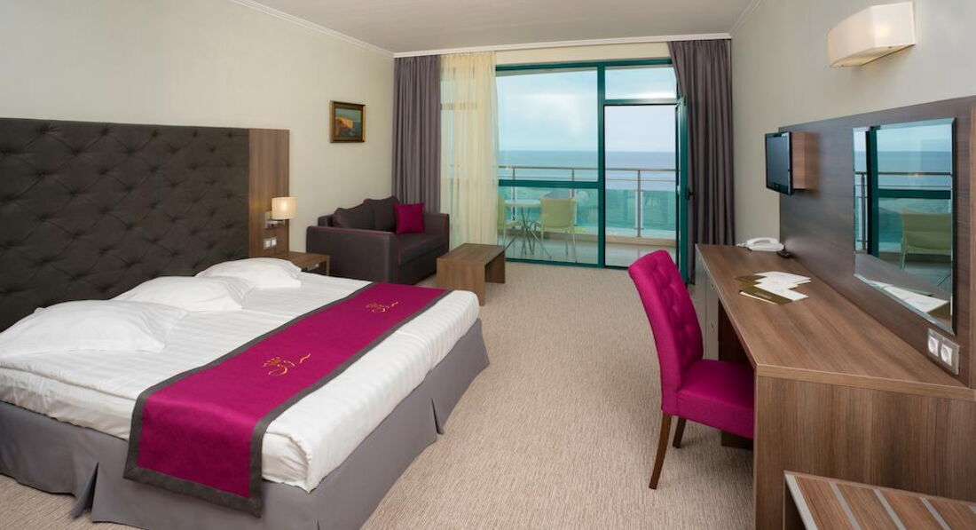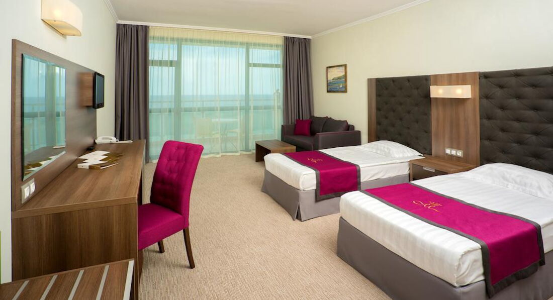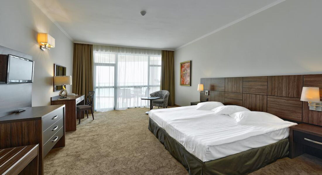 Из плюсов: чистота, все на своих местах, холодильник заправлен, соответствующее меню и расценки на столе, техника современная, телевизор новый, 96 каналов, пульт рабочий, ключ электронный, кондиционер не очень холодный, но в меру. Ремонт нас не расстроил, все нормально. В ванной комнате все в рабочем состоянии, все блестело, вода бежала прекрасно, если горячая, так она горячая. В общем по номеру у нас претензий нет, достойно. Да кондиционеры вмонтированы над проходом и частично задевает кровать, но ночью это не мешало, на здоровье не повлияло. Возможно каждому свое, но нас вопрос к кондиционерами не отяготил, есть альтернатива - дверь и горячий воздух с улицы или же регулировка оборотов кондиционера. Кровати "плохие", потому что моментально сманивали в сон. Матрацы удобные, белье не вызвало нареканий. На балконе цветы, правда их не особо поливали, как и те что росли внизу, стол и 2 стульчика. Wi-Fi сразу скажу дорогой. Неделя 40 или 60 лев, что не слабо для интернета, который работает достаточно неторопливо. Сейф в номере платный. 40 лв на неделю. Сейф небольшой. Если у Вас зеркалка, то либо на свой страх и риск, либо всегда с собой. Прецедентов с кражами и взломами не было. Убирали в номере как только повесим соответствующую табличку о необходимости уборки или по личному обращению к горничной, которая в течение дня всегда была на этаже. Она большой молодец. Уборку делает качественно, меняется все, кроме постельного (постельное раз-два в неделю примерно). Не скупились и оставляли чаевые, за что на кроватях нас, вернувшихся с пляжа, встречали, лебеди, крокодилы, слоны и тд. Это здорово и приятно.