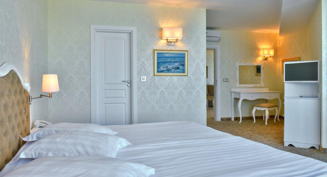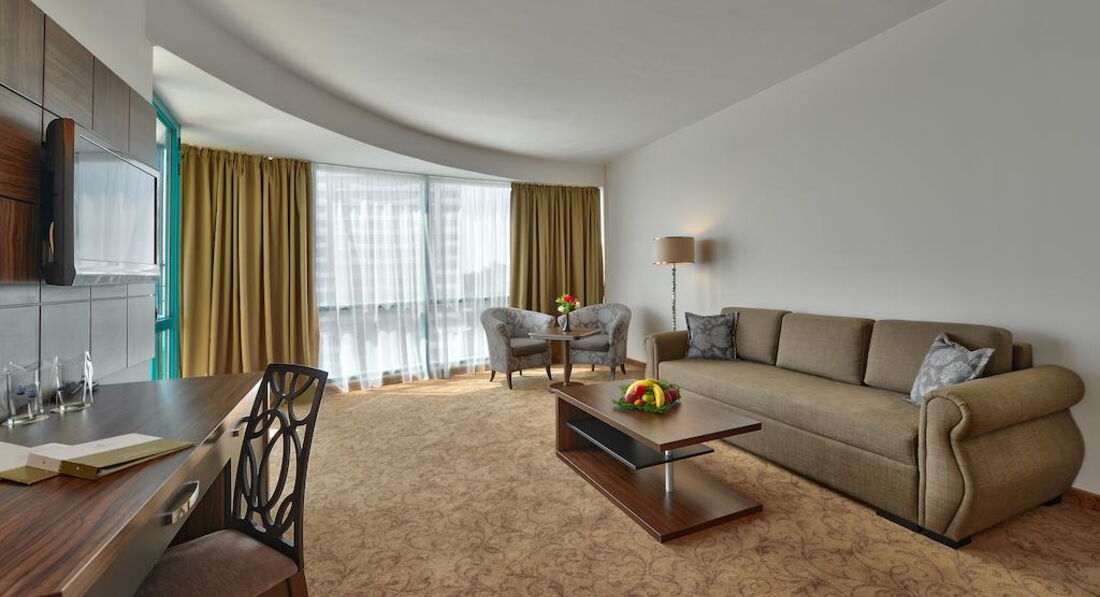 Suite Deluxe - розташовані на 7 поверсі, з видом на море, більш багата обстановка, спальня з двоспальним ліжком (200/200 см) і вітальня з диваном, суміжні двері, дод. місце – розкладне ліжко (140 x 190 см), додатковий туалет, макс. 3 дор. + 1 дит., 52 м2.