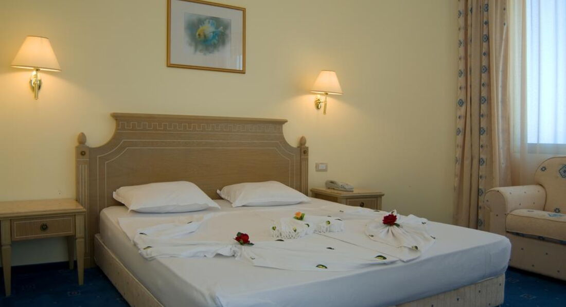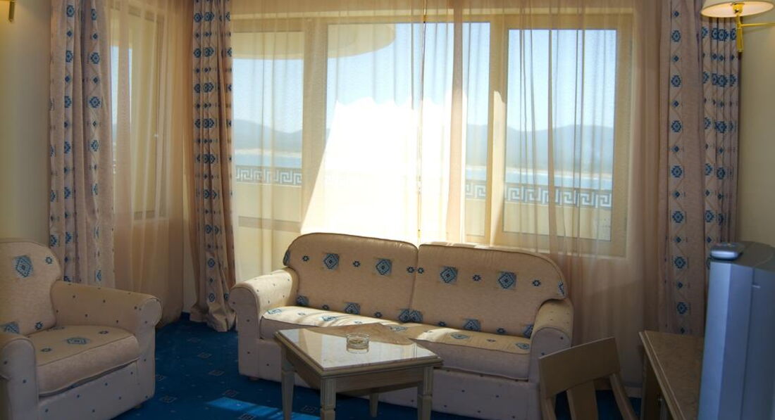 Отель и размещение: у нас был suite двухкомнатный с видом на море. Номер очень просторный, 2 телевизора плоских, бесплатный мини бар с газировкой и водой в день приезда, ванная большая, к тому же есть второй туалет- когда живешь вчетвером очень кстати:) вид на море отличный, с другой стороны волнореза, в номере есть большое окно (как эркер) до пола, тоже море через него хорошо смотрится, ни разу не пожалели, что взяли такой номер. Считаю своим долгом предупредить, что тапочек, халата и шампуня в номере нет, а то у многих потом это вызывает волну возмущения и разочарования . Кусковое мыло есть, есть также жидкий гель для душа на стене ванны. Я всегда пользуясь своим шампунем , а халаты и тапки махровые не люблю, поэтому мне было все равно. Кстати , с утюгами там тоже проблема ни в номере, ни на неспешно не было. У нас был свой маленький походный, как другие люди справлялись не знаю, можно было наверное отдать в прачечную на глажку. Фен есть, но не очень мощный. Wi-fi в номере ловит , стоит например на 3 дня 25 левов, на неделю 50 и т.п. есть 2 русских канала в телевизоре. Убирали хорошо. На балконе было 2 гнезда ласточек:) кстати, мы оплачивали позднее выселение в день отъезда. Наш номер продлить не смогли - дали стандартный. В принципе тоже ничего, но телевизор уже не плоский, вид на море не тот. Продление стоит 80 левов.